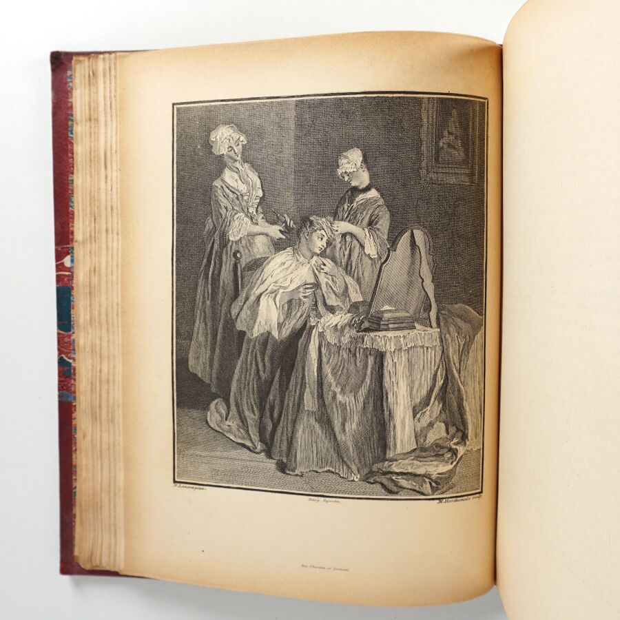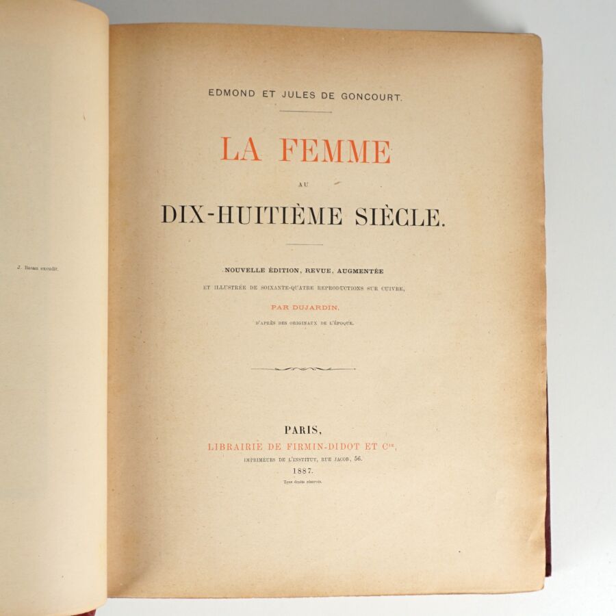 GONCOURT (Edmond & Jules de). La Femme au dix-huitième siècle. Paris, Firmin-Didot, 1887. In-4, demi-chagrin rouge à coins, dos à nerfs richement orné, titre doré, double filet doré, tête dorée (reliure de l'éditeur).