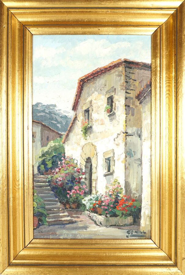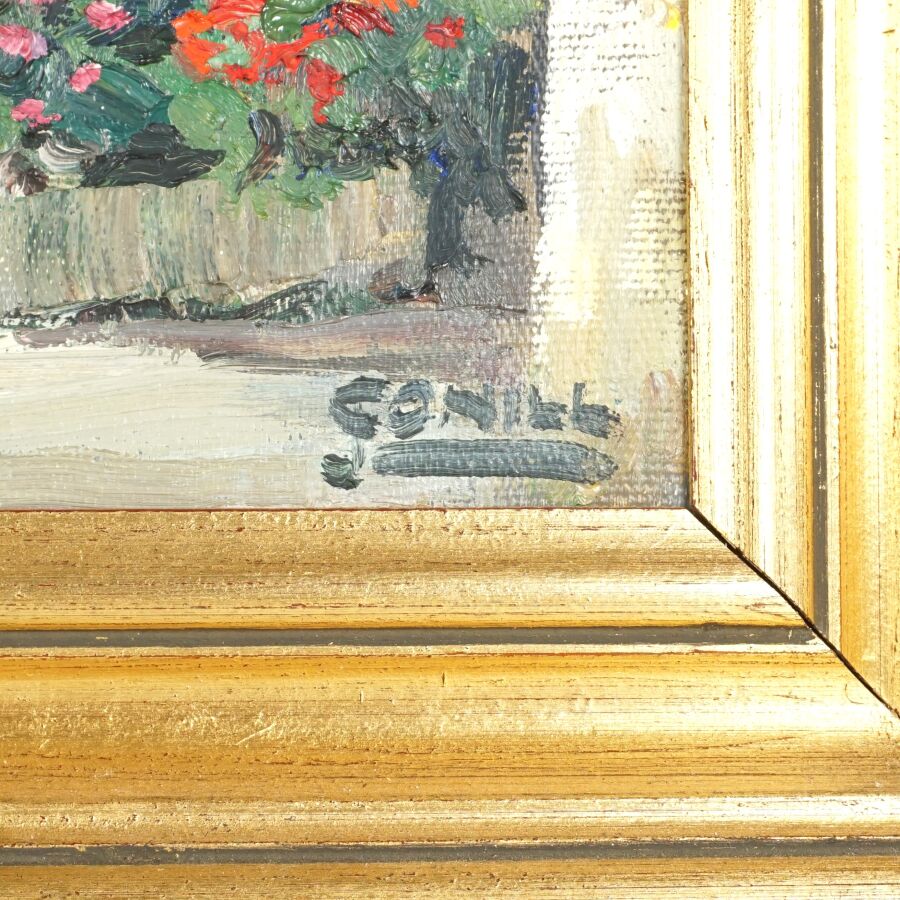 GONILL (XXe), "Fleurs près de l'escalier de pierre", huile sur toile signée en bas à droite, contresignée au dos, 45 x 26 cm.