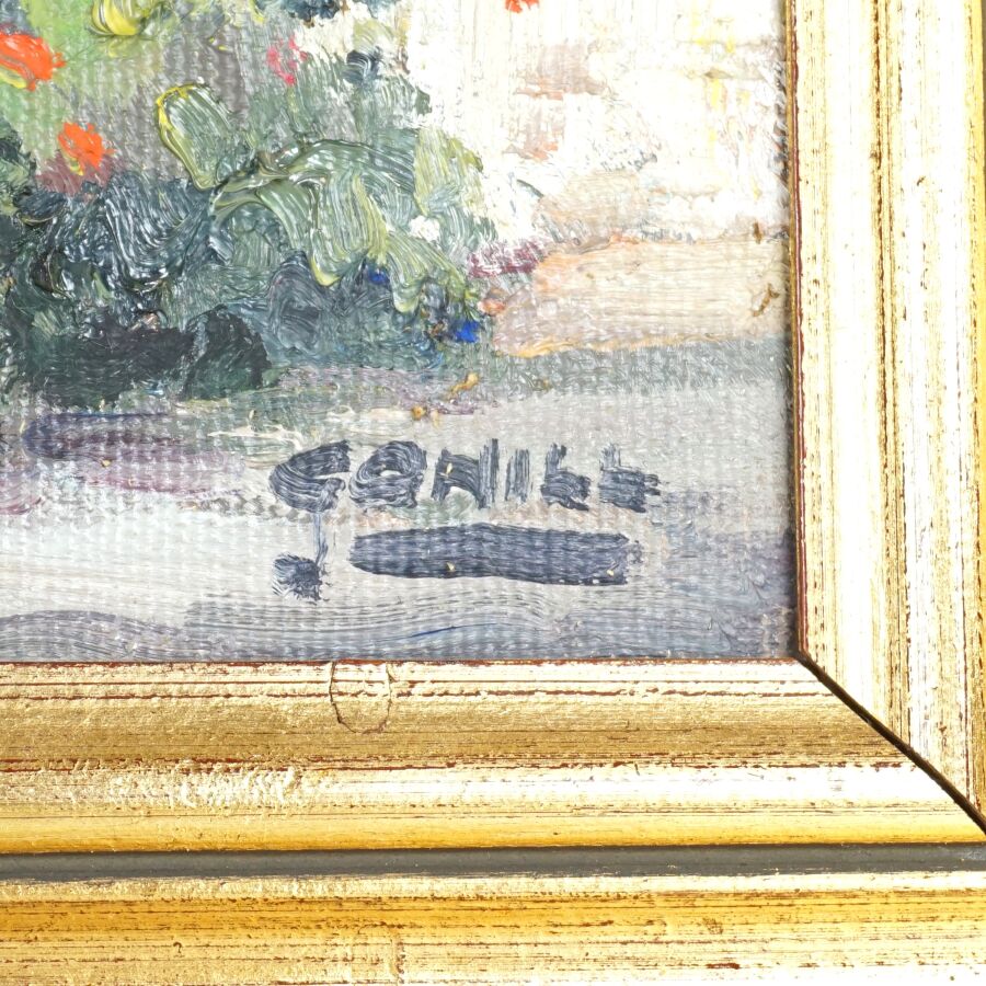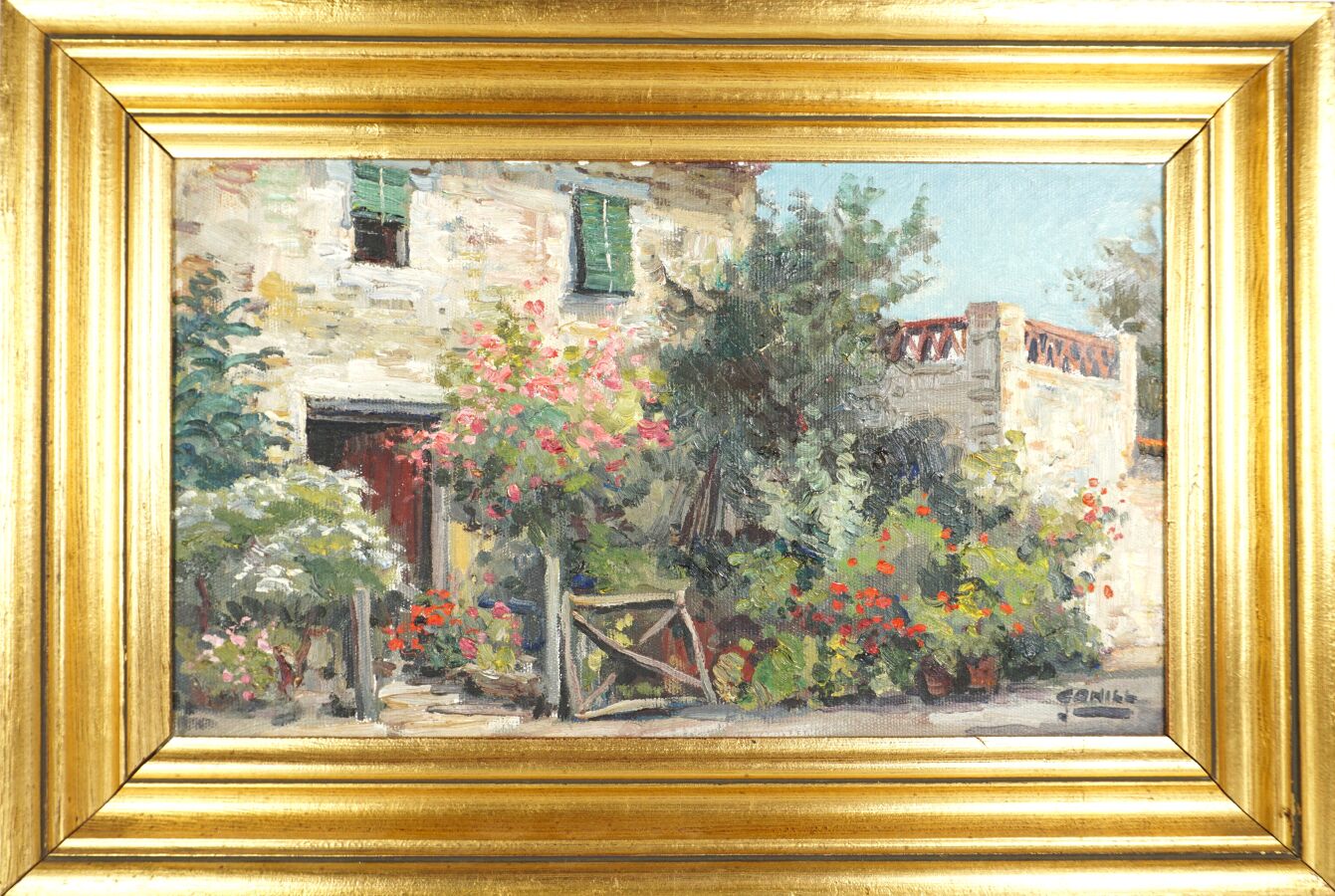 GONILL (XXe), "Terrasses fleuries", huile sur toile signée en bas à droite, contresignée au dos, 26 x 45 cm.