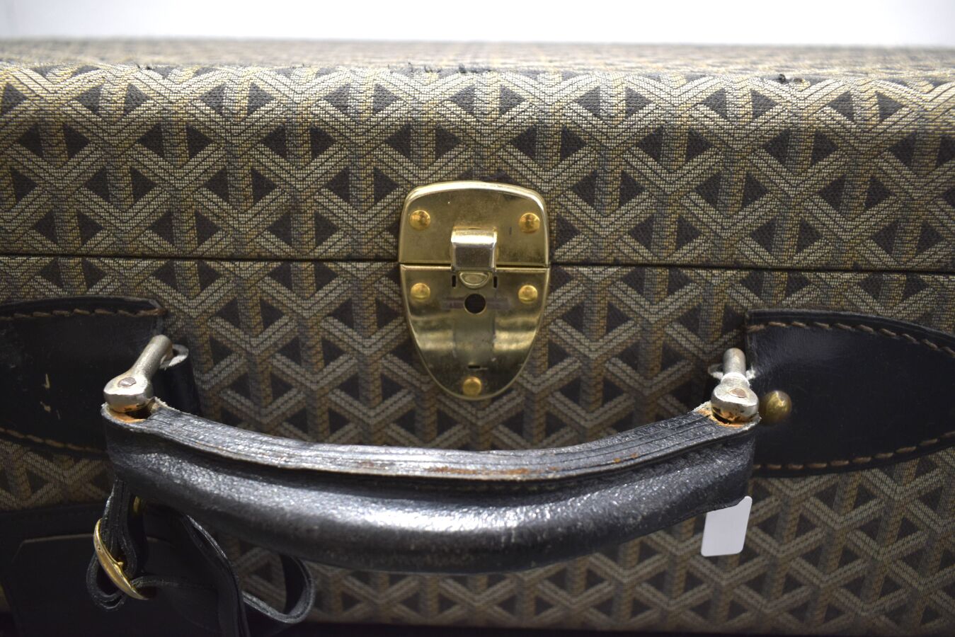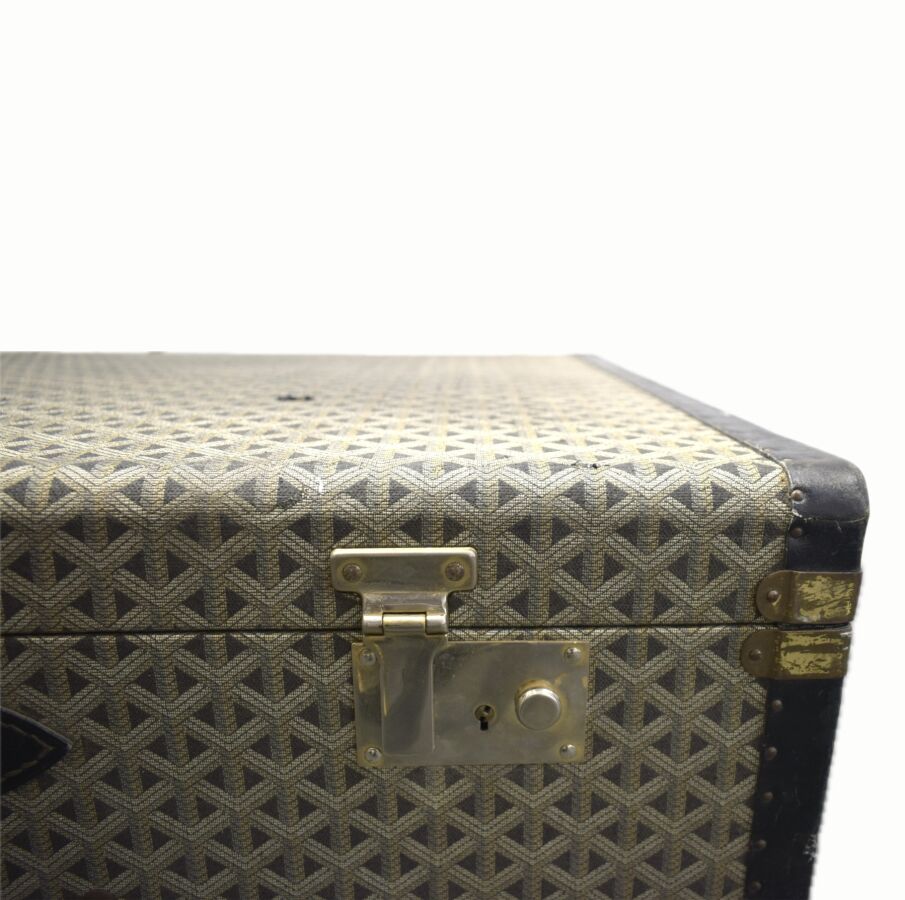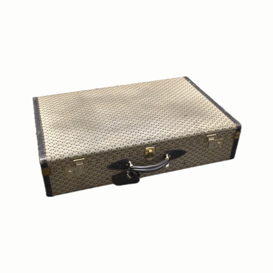 GOYARD PARIS : Valise rigide en toile tissée, bordures en cuir noir, renforts en laiton doré, intérieur en tissu couleur vanille, poignée en cuir, 54 x 80 x 25 cm, (fermeture centrale accidentée, usures et trou sur la toile, rayures sur les bordures)