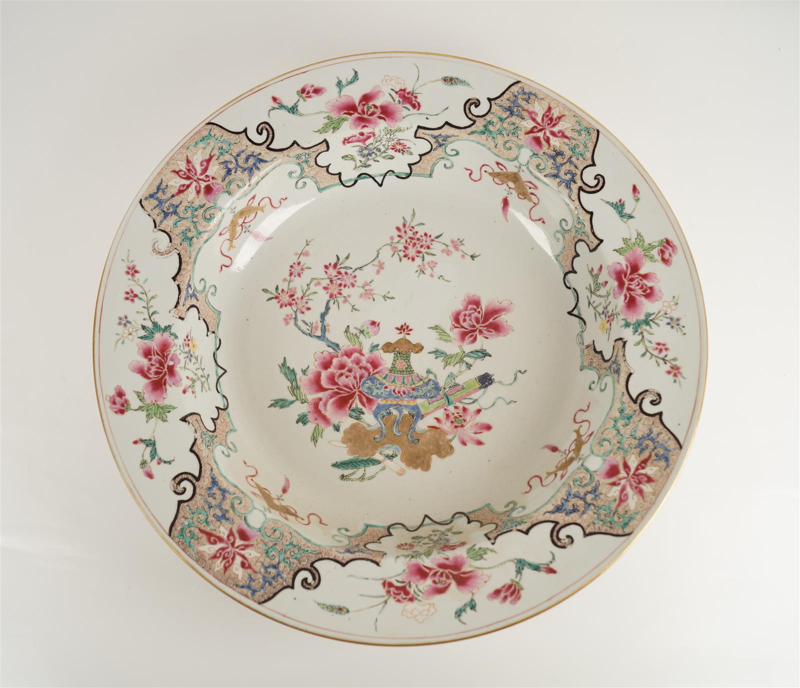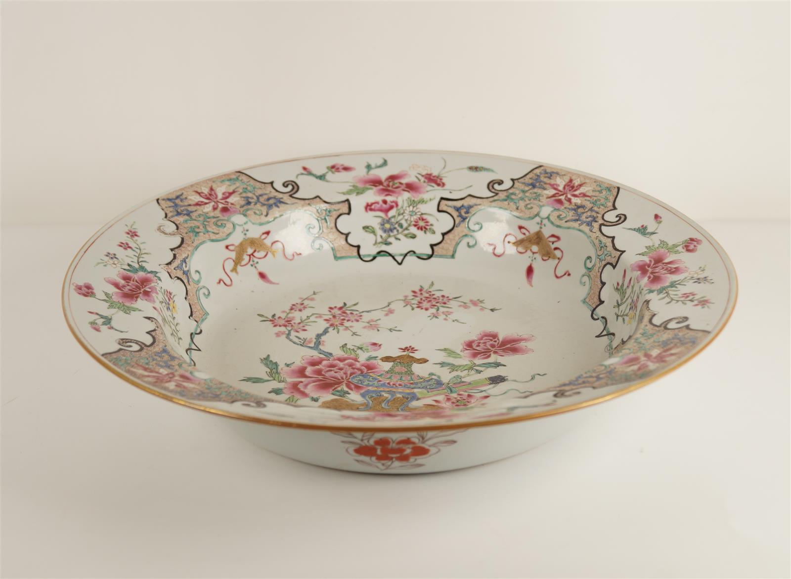 Grand bassin en porcelaine de commande, à décor en émaux de la famille rose d'un brûle parfum en médaillon central, entouré d'arbustes en fleurs, le pourtour orné de fleurs de lotus et de pivoines, Chine, 18e siècle, Compagnie des Indes, D. 40 cm (bel état)