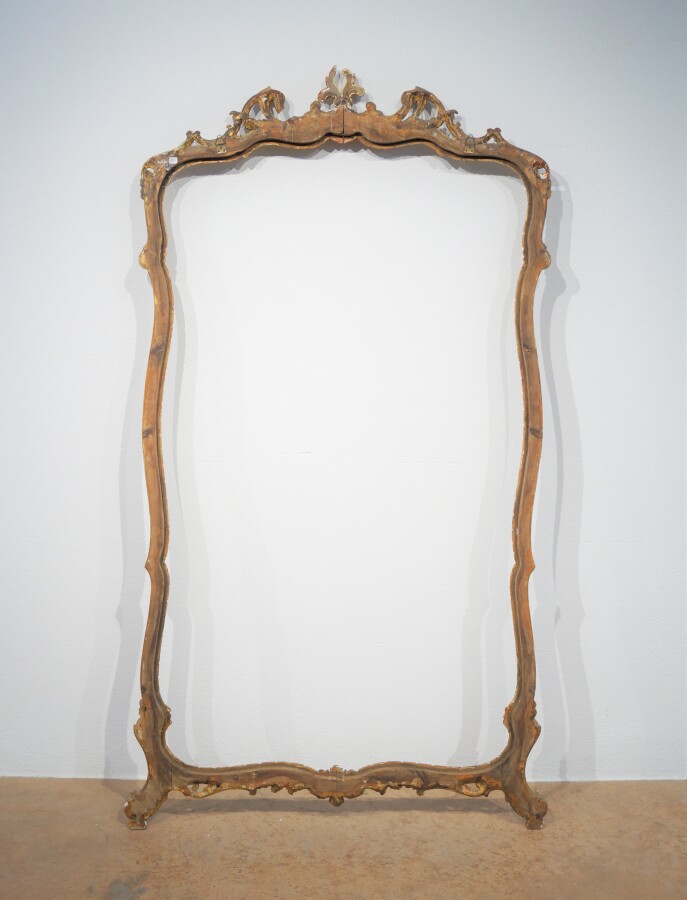 Grand cadre de style Louis XV en bois et stuc doré et peint à décor de fleurettes sur fond vert, il repose sur deux petits pieds à enroulements et leurs bouchons, 196 x 105 cm (accidents, fronton cassé-recollé).