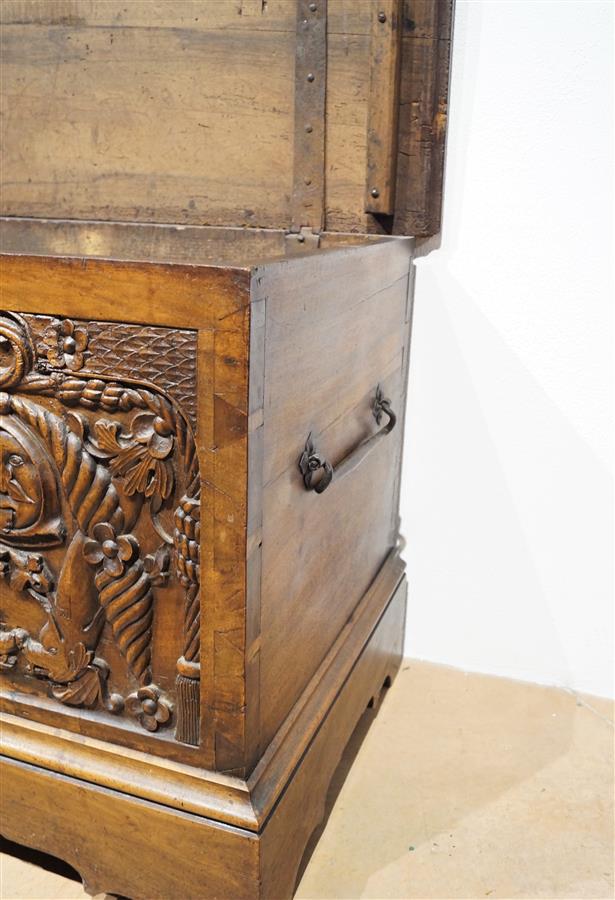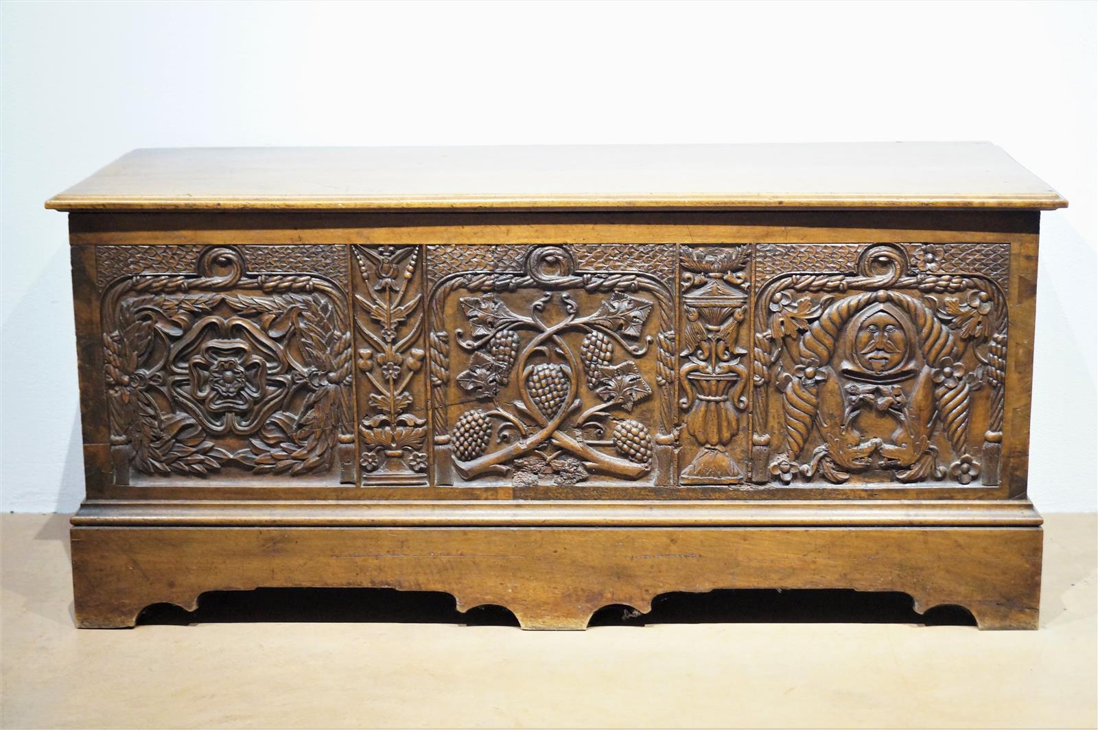 Grand coffre en bois naturel sculpté en façade dans des caissons de rosace, urne, entrelacs végétaux et pommes de pin, personnage, il ouvre à un grand abattant, grandes poignées latérales en métal, H. 71 cm., L. 159 cm., P. 59.5 cm.