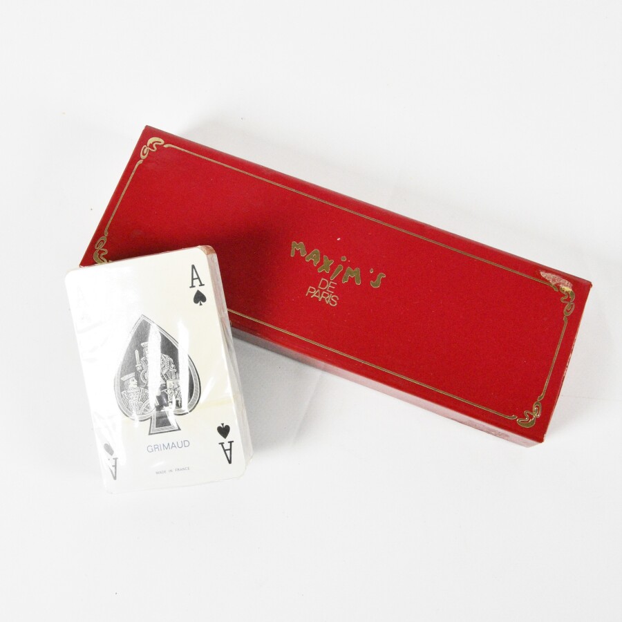 Grand coffret en bois exotique comprenant de nombreux jeux de cartes, palets de jeux, boîte de bridge et plumes, 57 x 28 x H. 24 cm (en l'état). On joint une mallette de peinture.
