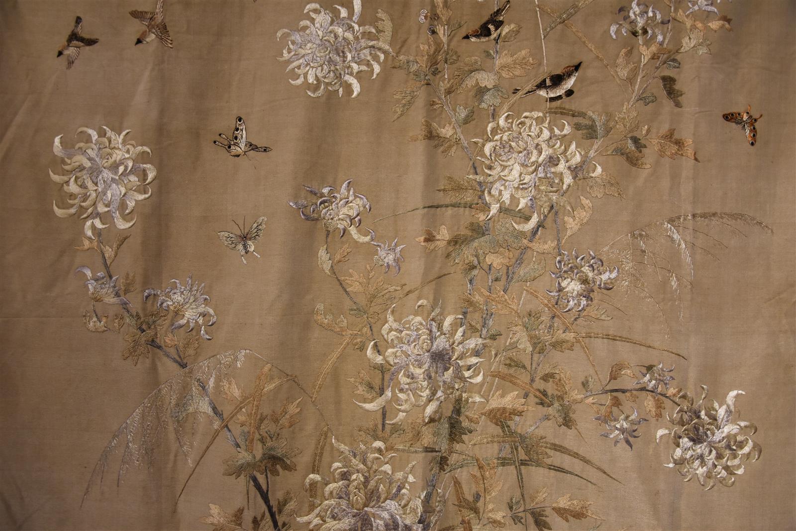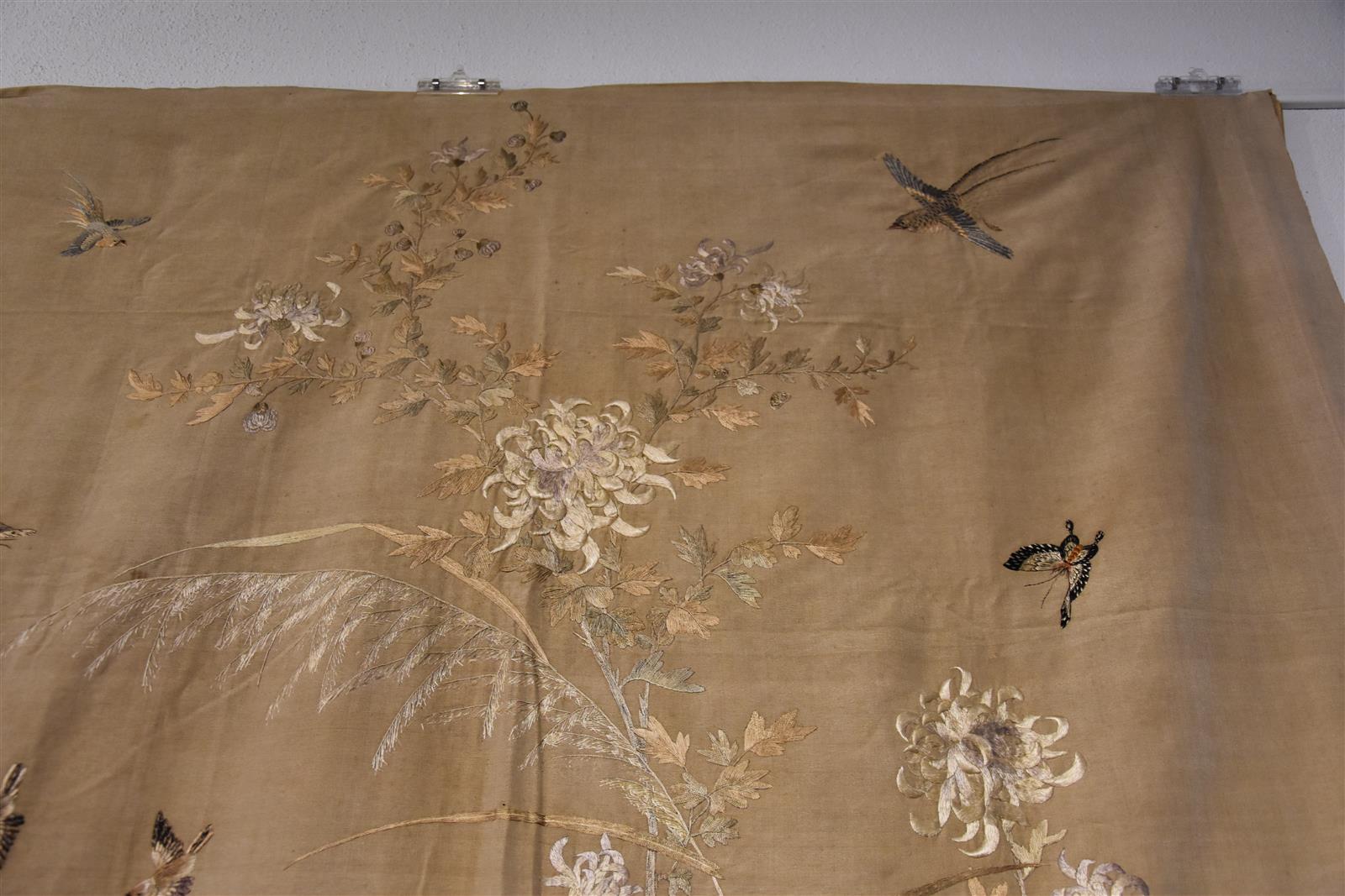 Grand panneau en satin de soie et lin, à décor d'un paon au pied d'un pivoinier en fleurs, oiseaux et papillons, Chine, circa 1900, 240 x 135 cm