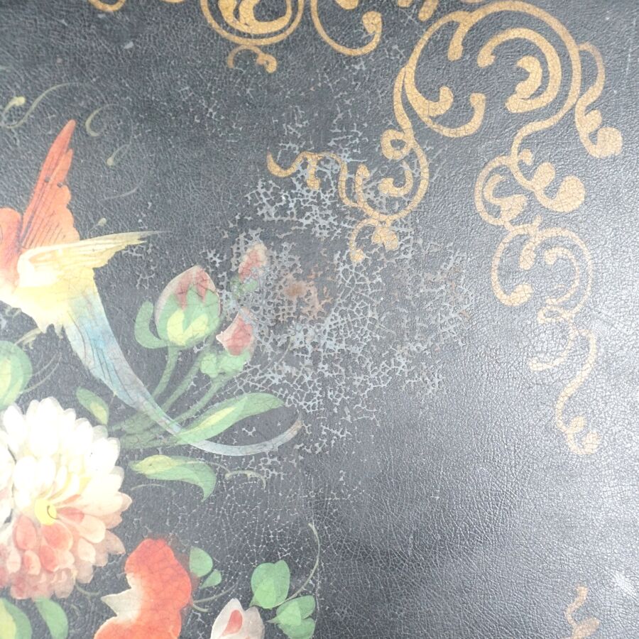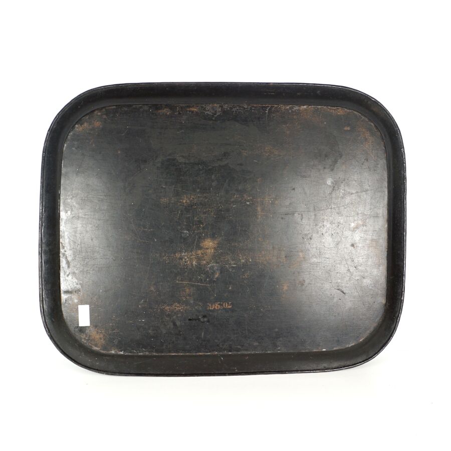 Grand plateau rectangulaire aux angles arrondis en tôle peinte en noir, orné en son centre d'un bouquet de fleurs polychromes et d'oiseaux en vol, entouré d'un décor de rinceaux dorés, 73 x 58.5 cm. (usures sur le pourtours, craquelures et rayures sur la couche picturale).