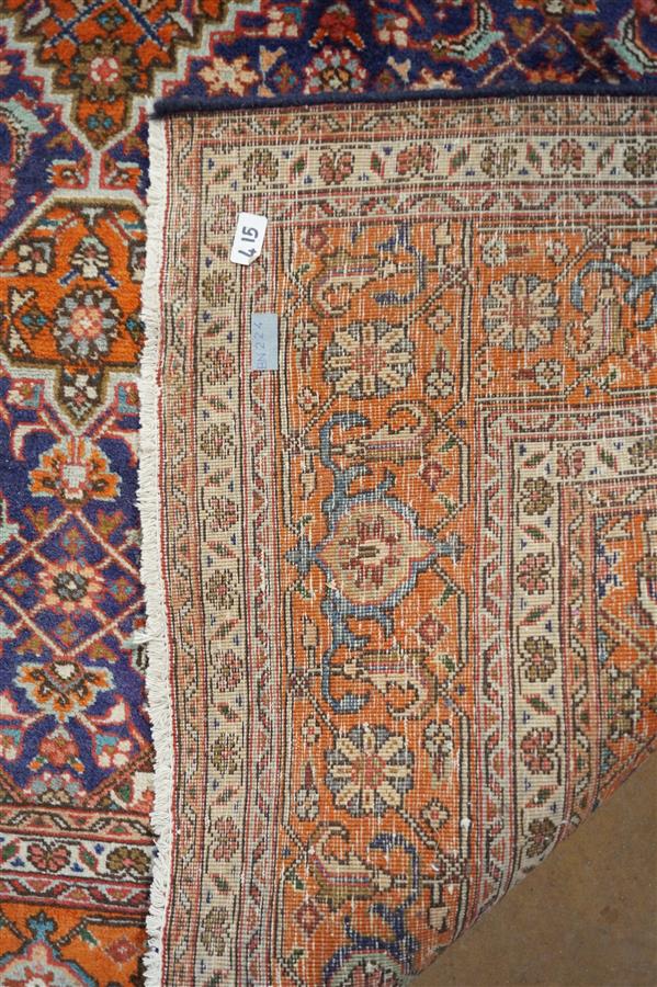 Grand tapis laine à décor de fleurs et volatiles stylisés sur fond orangé et bleu, la bordure à motifs d'urnes et de fleurs alternées sur fond orangé, 297 x 205 cm