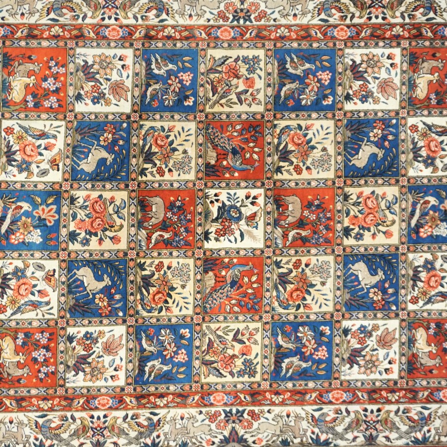 Grand tapis mécanique figurant des animaux, oiseaux, fleurs, sur fond quadricolore (rouge, bleu, beige, blanc) cloisonnés par des frises de fleurettes, 335 x 216 cm ( porte une étiquette sur le dos).