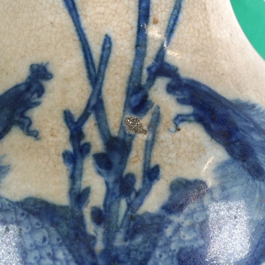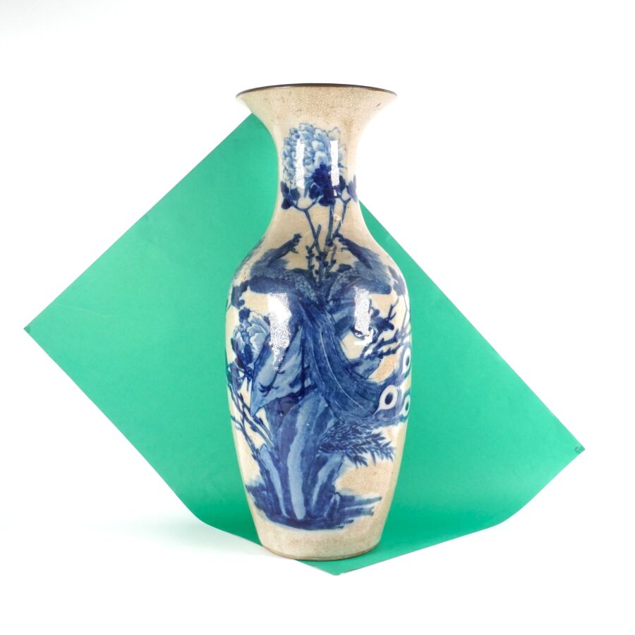 Grand vase de forme balustre, en porcelaine émaillée craquelée beige, à décor en bleu, d'un oiseau paradis parmi des fleurs de pivoines, Chine, fin du 19ème siècle, H. 60 cm (fêle au col).