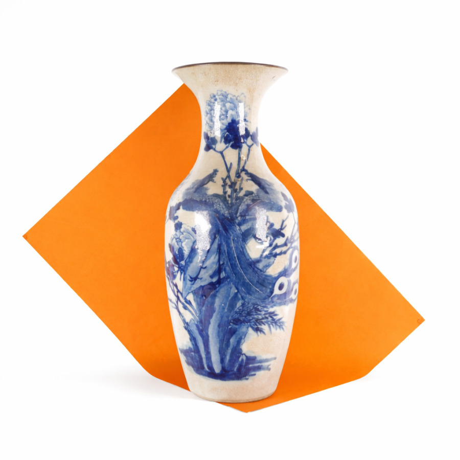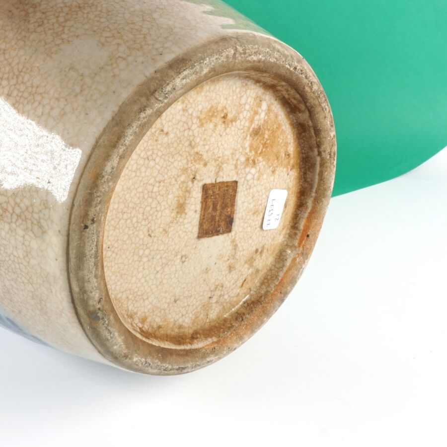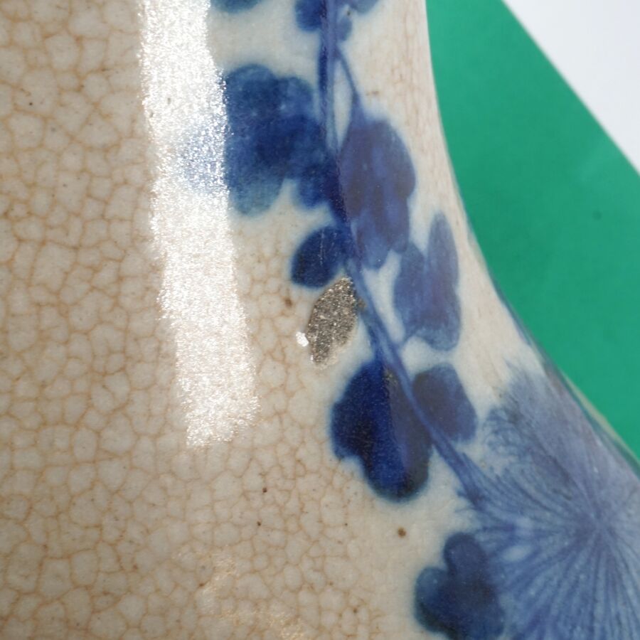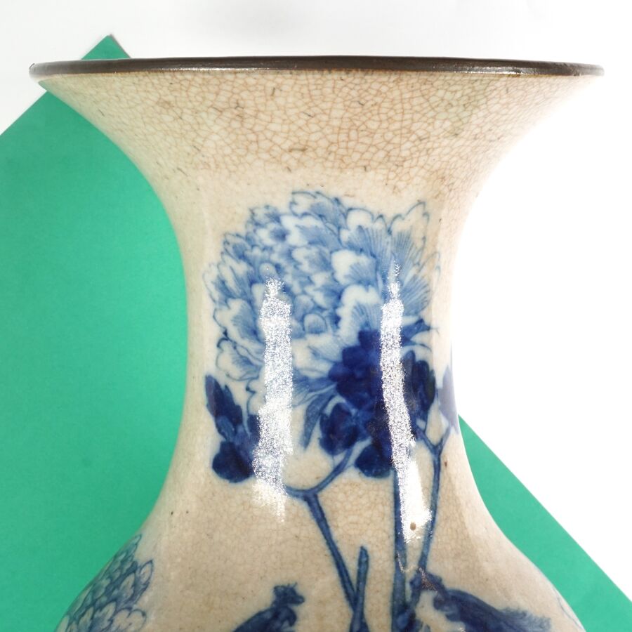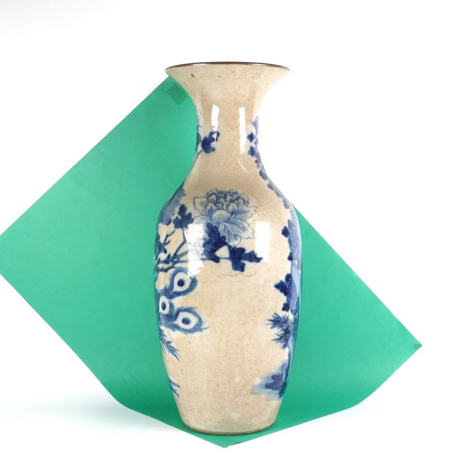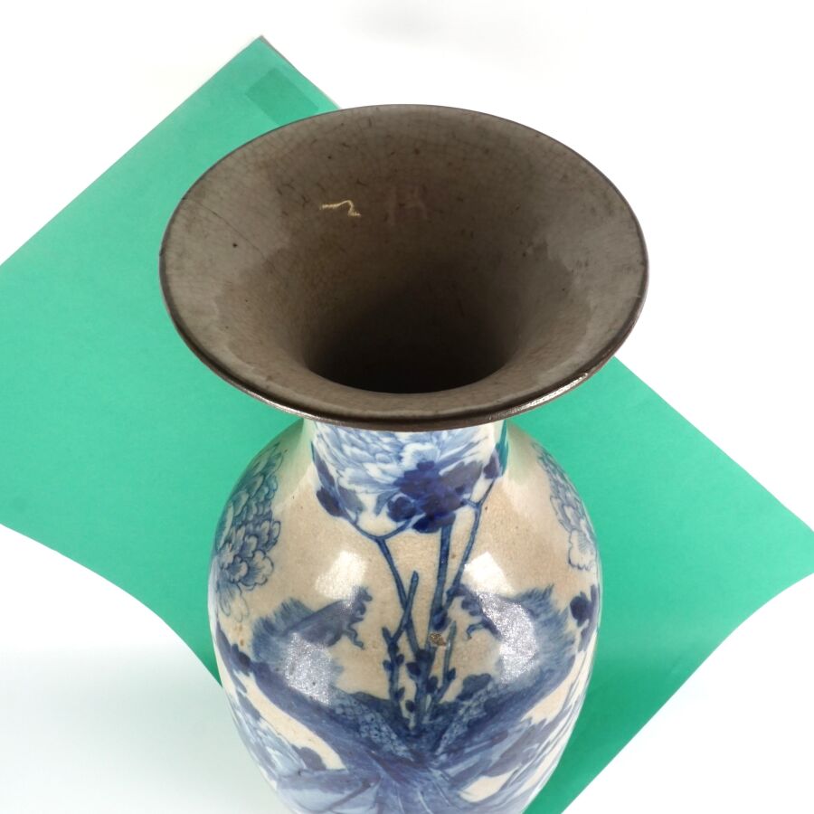 Grand vase de forme balustre, en porcelaine émaillée craquelée beige, à décor en bleu, d'un oiseau paradis parmi des fleurs de pivoines, Chine, fin du 19ème siècle, H. 60 cm (fêle au col).