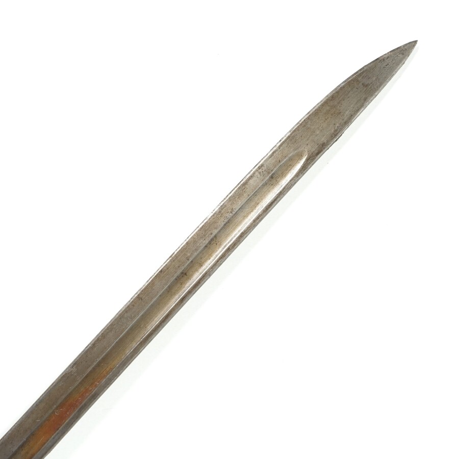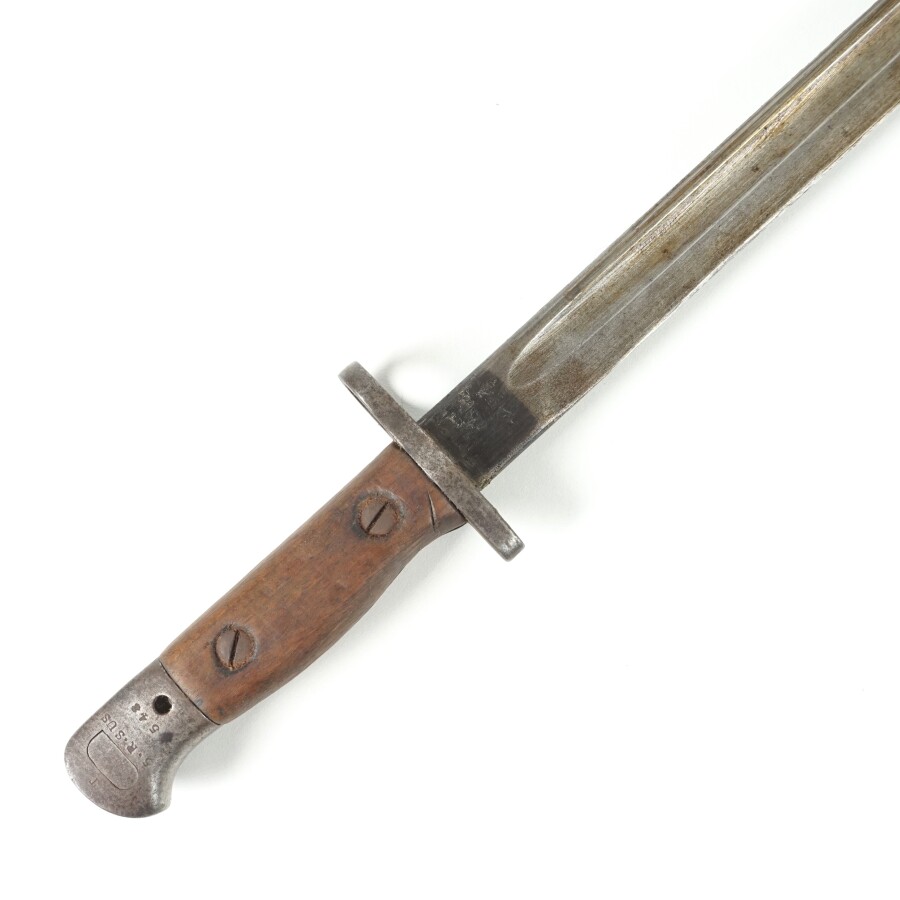 GRANDE-BRETAGNE - BAIONNETTE MODELE 1907, second modèle, pommeau percé d'un trou de huilage, régimenté " 5Rsus548 ", plaquettes de la poignée en bois, lame à pans creux et à un tranchant marquée au talon " 1907 Wilkinson ", fourreau en cuir à garnitures en acier, BE/TBE.