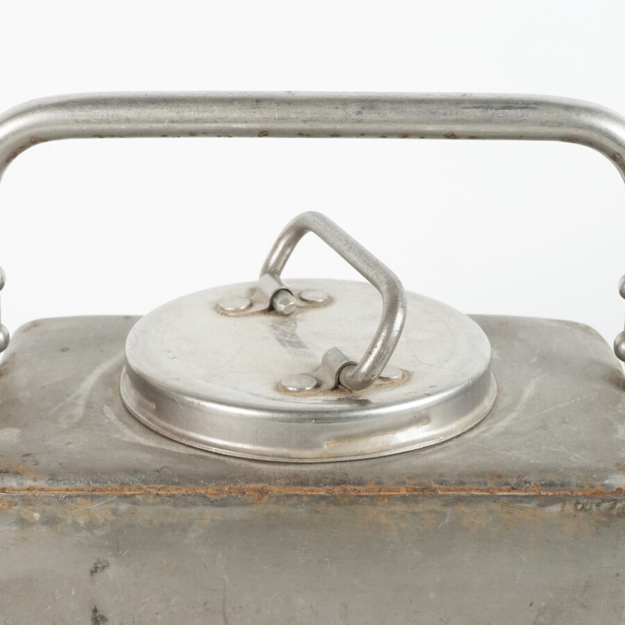 GRANDE-BRETAGNE - CANTINE en aluminium de forme rectangulaire à grande anse de transport rabattable, bouchon semblant hermétique, probablement pour constituer une réserve de lait ou d'eau, nombreuses inscriptions et références au-dessous dont 21C/1586 et AM sous couronne, environ 35 x 30 x 15 cm, Seconde Guerre Mondiale, BE/TBE.