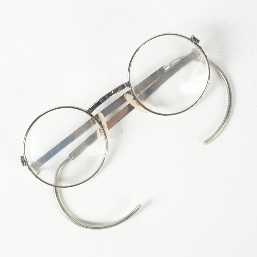 GRANDE-BRETAGNE - PAIRE DE LUNETTES réglementaires à verres rond et montures plates en acier pour utilisation sous masque anti-gaz, inscription sur le pont intérieur " TOC et 66 ", étui avec étiquette intérieure marquée " BRITISH W " sous triangle, BE/TBE.