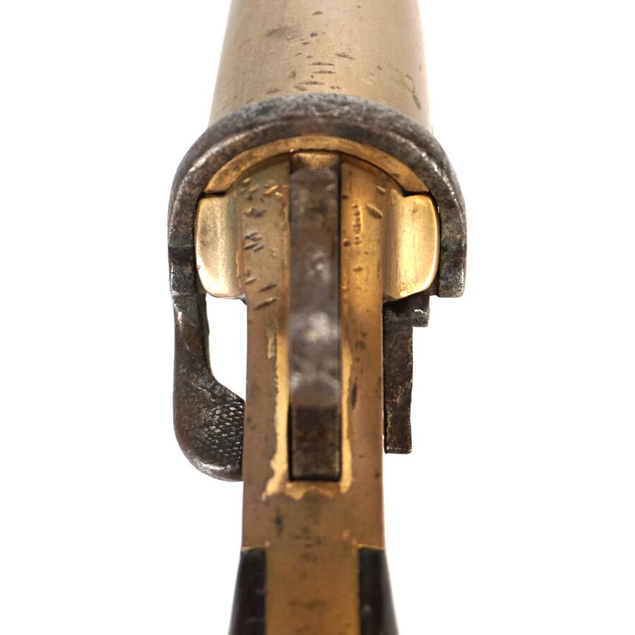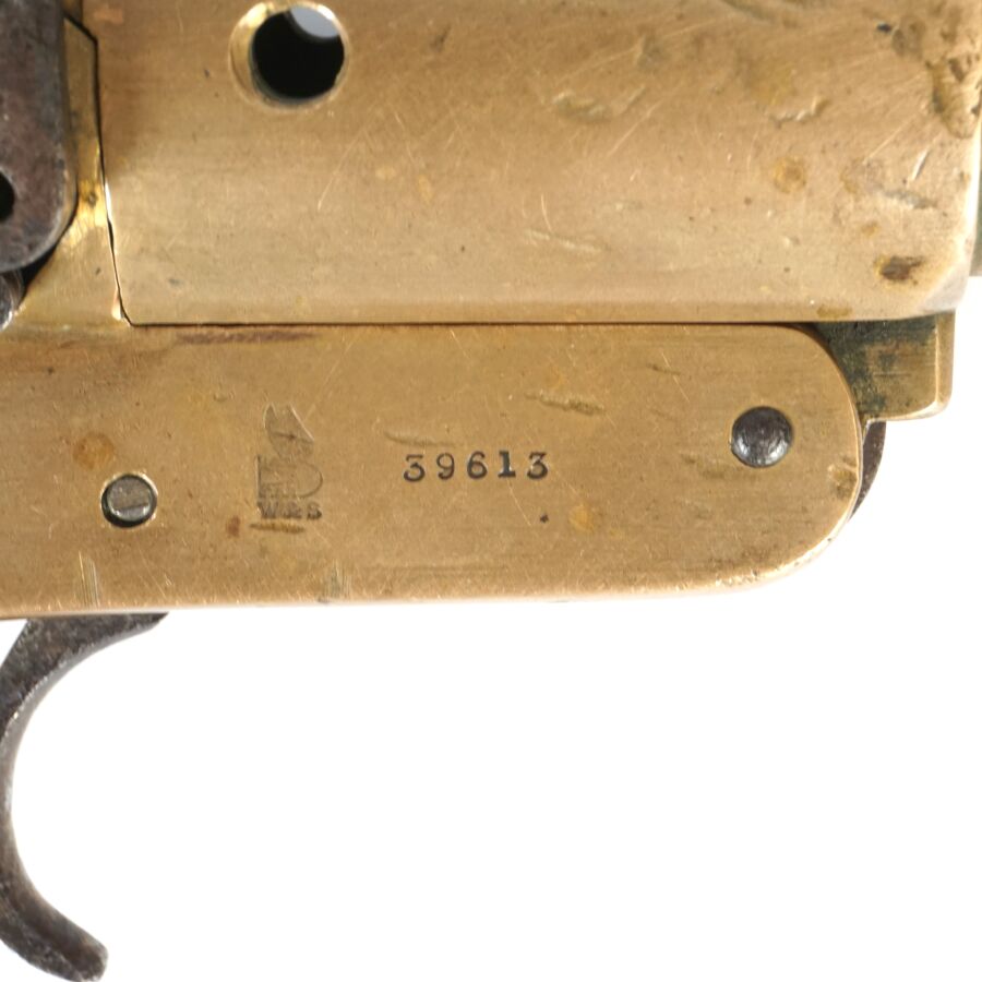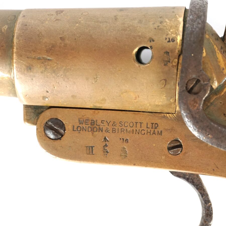 GRANDE-BRETAGNE - PISTOLET SIGNALEUR LANCE-FUSEE WEBLEY, MODELE MARK III, calibre 4, un coup, canon rond renforcé au tonnerre, carcasse en laiton marquée et datée « WEBLEY SCOTT LONDON 1916 », levier d'ouverture sur le côté, plaquette de la crosse en noyer, anneau de calotte, longueur : 21 cm, Première Guerre Mondiale, BE.