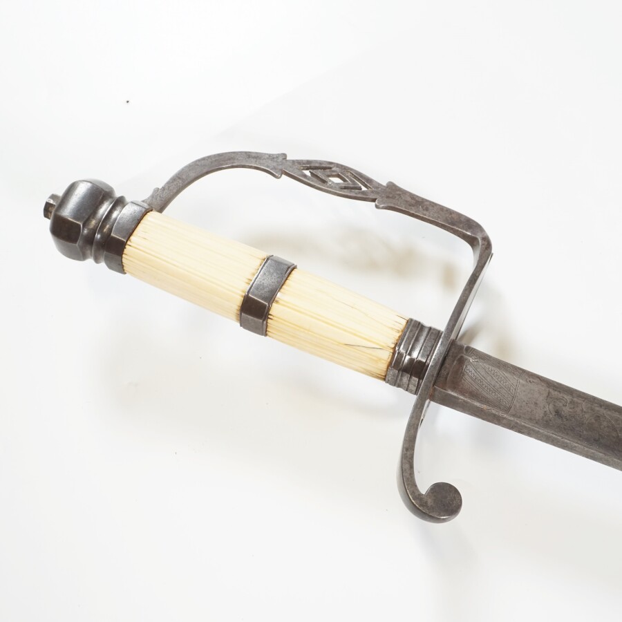 GRANDE-BRETAGNE - SABRE, monture en fer à une branche plate ouvragée dans la partie centrale et plateau ajouré, poignée à rainures verticales et bague centrale en fer. Lame piquée de 74 cm à pans creux et dos plat, gravée au premier tiers de rinceaux feuillagés, monogramme sous couronne et blason sous couronne marqué " HONI SOIT QUI MAL Y PENSE " et " DIEU ET MON DROIT " (ensemble difficilement lisible), jeu dans la monture, poignée avec de légers manques, sans fourreau, fin XVIIIème, début XIXème, EM.