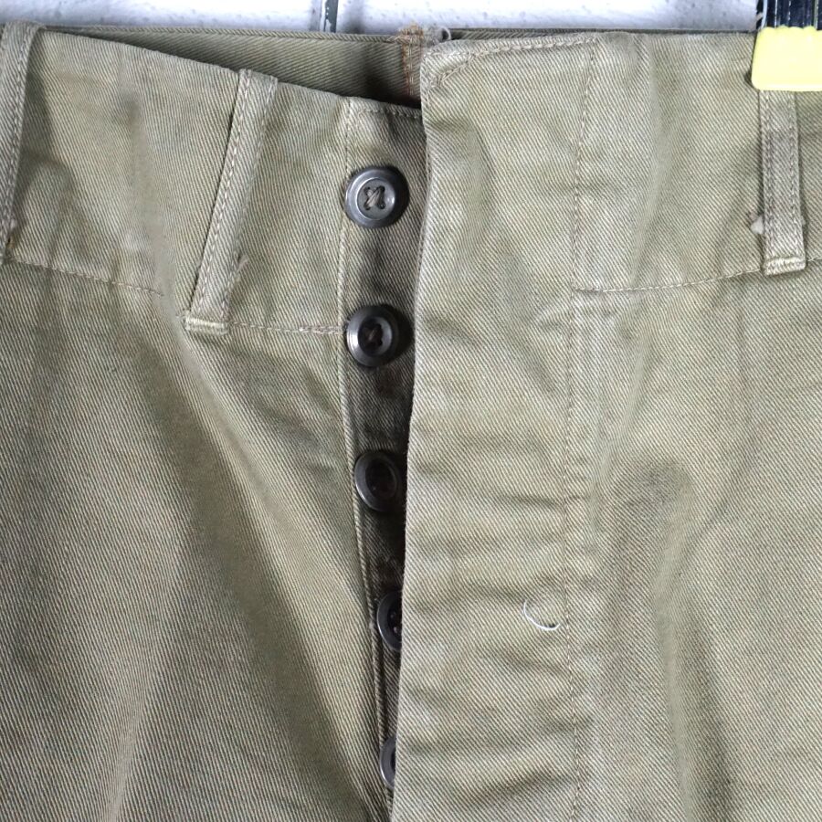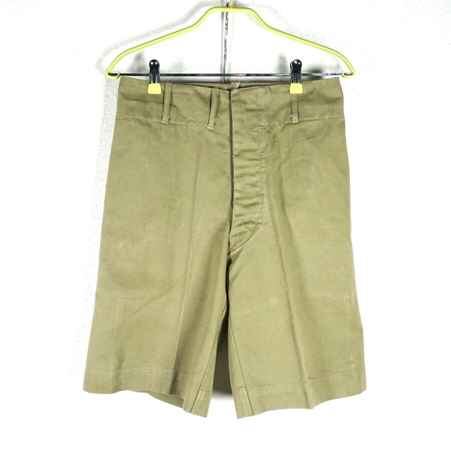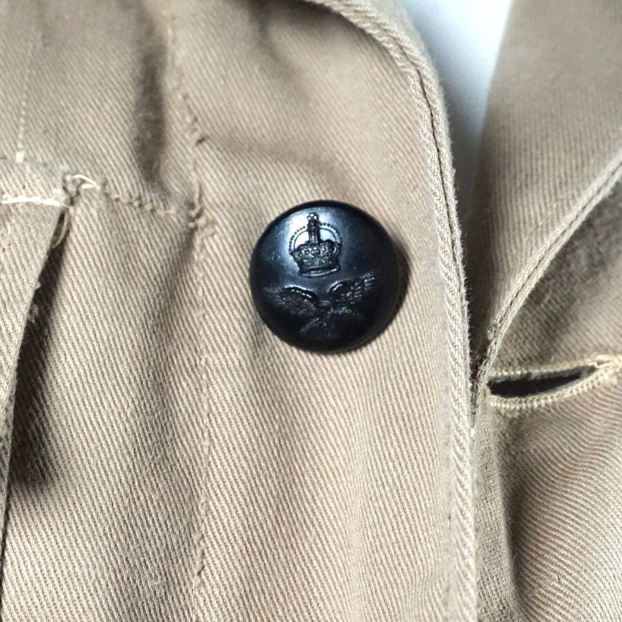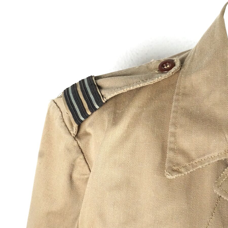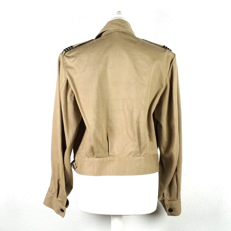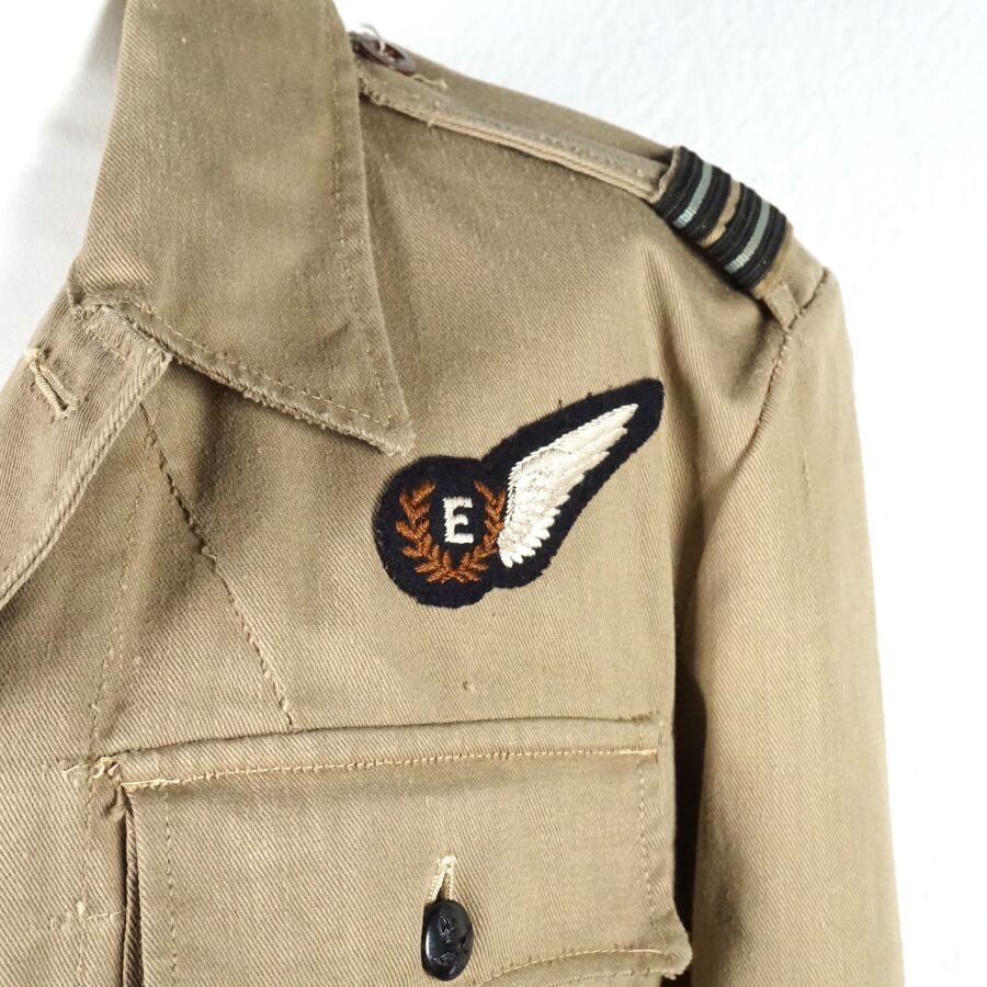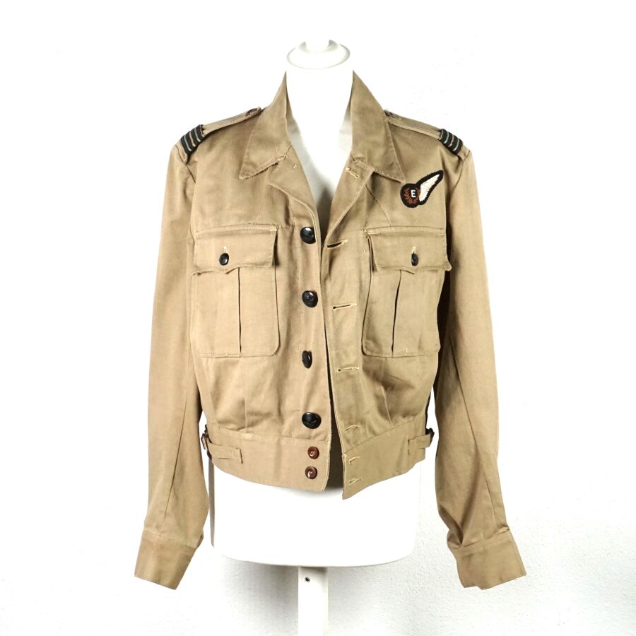 GRANDE-BRETAGNE - UNIFORME D'OFFICIER INGENIEURE DE LA ROYAL AIR FORCE comprenant : BATTLE DRESS en coton beige ouvrant à 4 importants boutons en bakélite noir, 2 poches, grade d'officier ingénieure de vol au pattes de col, insigne ingénieur poitrine, étiquette intérieure de fabrication australienne N88, daté " 1944 ", taille 9 et PANTALON en coton vert olive daté " 1942 ", taille 40, Seconde Guerre Mondiale, BE/TBE.