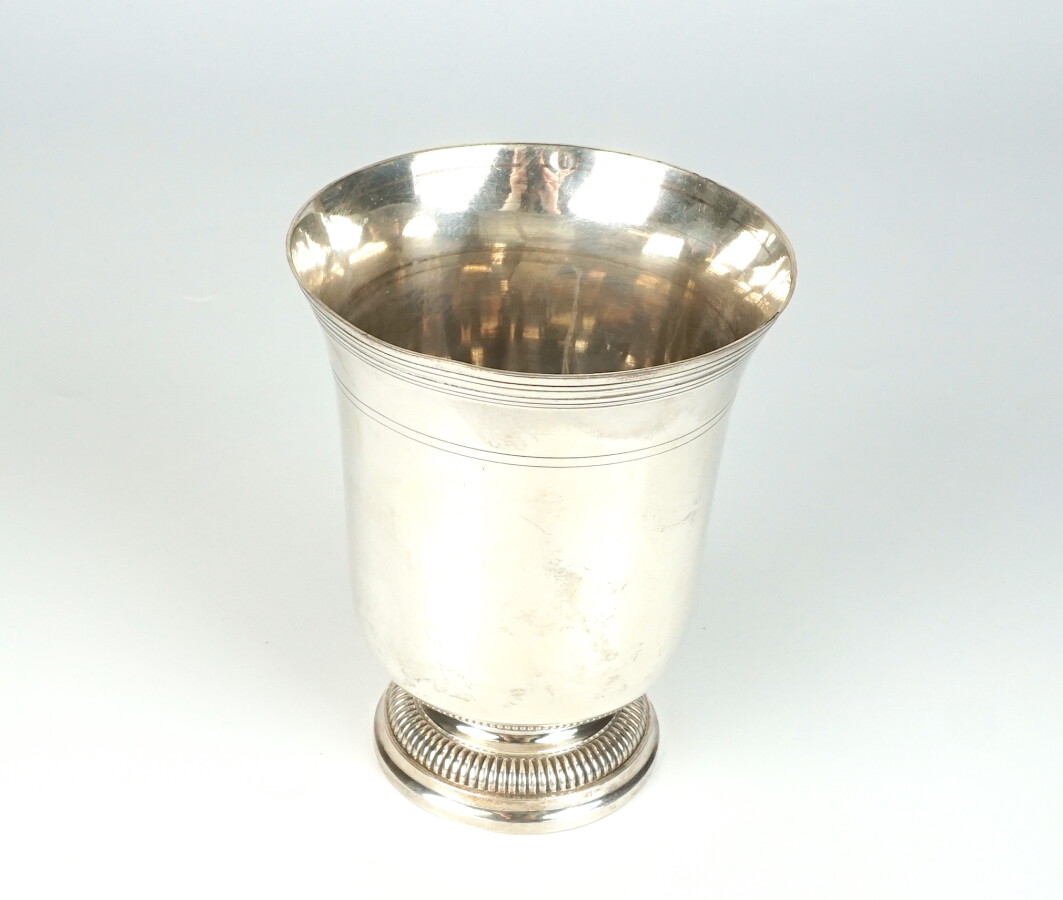 Grande timbale tulipe sur piédouche en argent, poinçon Minerve 1er titre, le col souligné de filets, le piédouche agrémenté de godrons, H. 10.5 cm. Poids brut : 125 g environ.