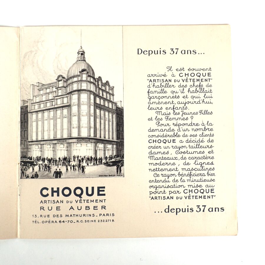 Grands Magasins CHOQUE. CHOQUE "artisan du vêtement". Paris, Choque, 1937. Plaquette in-12 carré agrafée, couverture orange et noir, illustrée d'une vignette en couleurs (dos frotté).
