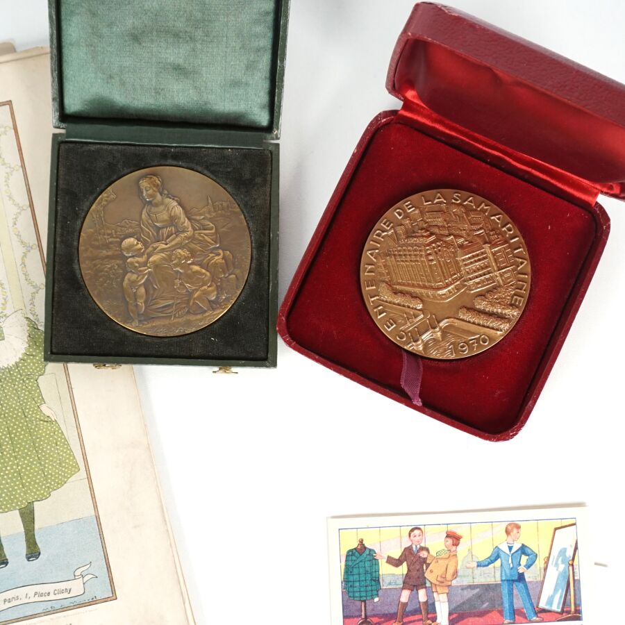 - 2 médailles commémoratives du centenaire de La Belle Jardinière (dont une grande sous coffret) 1930 + une médaille commémorative du centenaire de la Samaritaine, sous coffret, 1970 + une médaille commémorative du cinquantenaire des grands magasins du Louvre 1905, sous coffret.