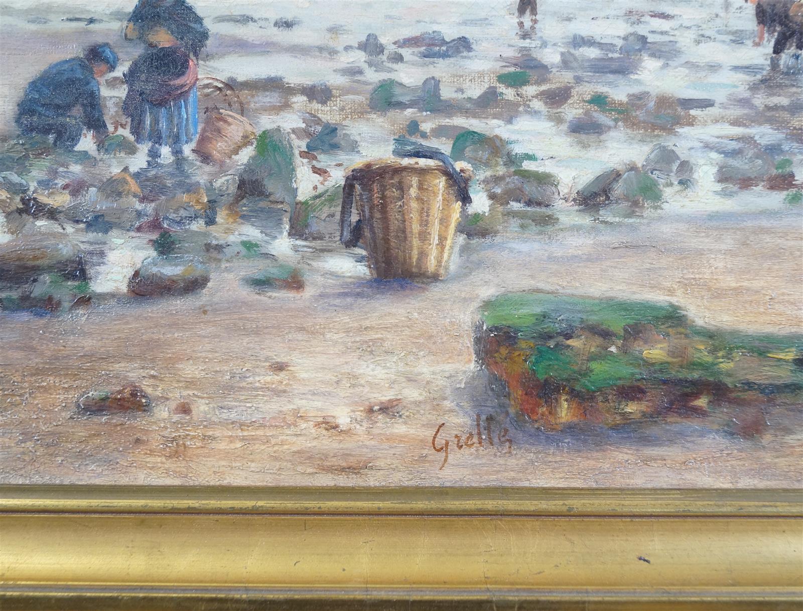 GRELLE (XXe), "Pêche à pied", huile sur toile signée en bas à droite, 47 x 72 cm (restauration, un trou en haut à droite, accidents et manques).