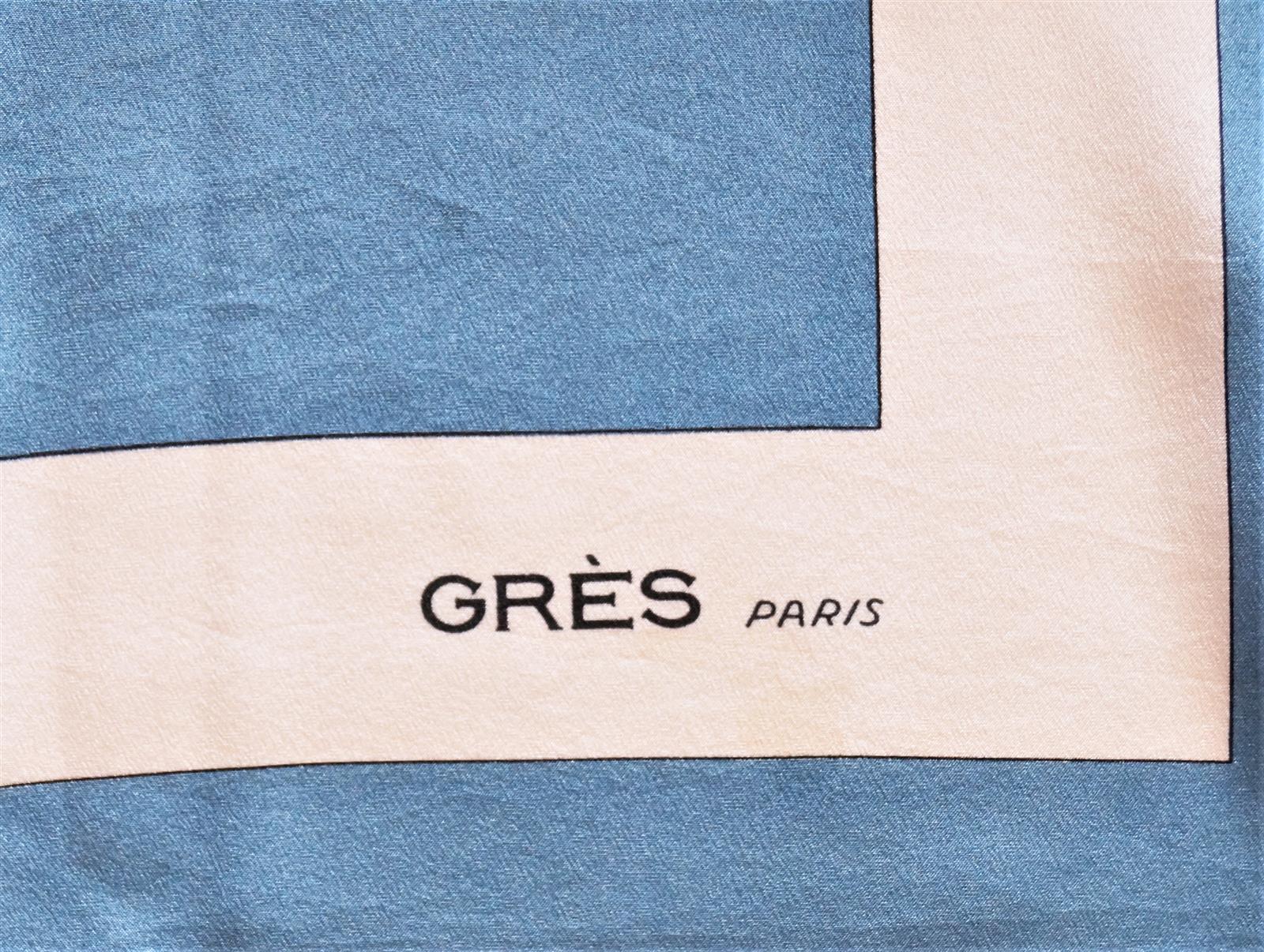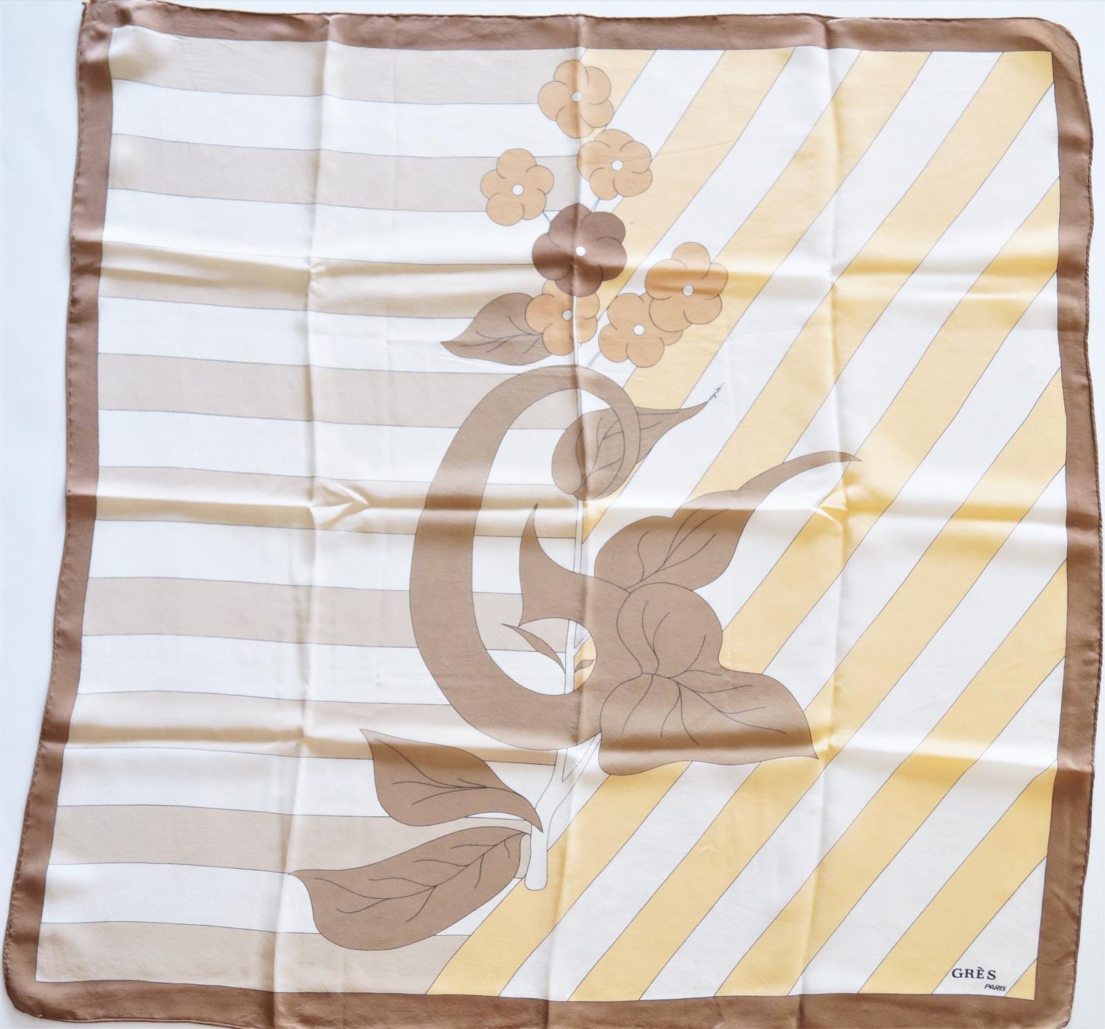 GRES : Ensemble de 2 foulards en soie, à décor d'oiseau sur fond bleu et de fleurs sur fond marron, 87 x 85 cm et 76 x 76 cm.