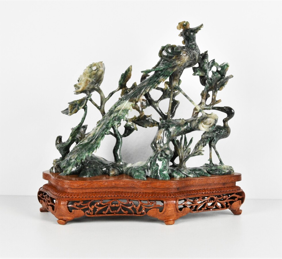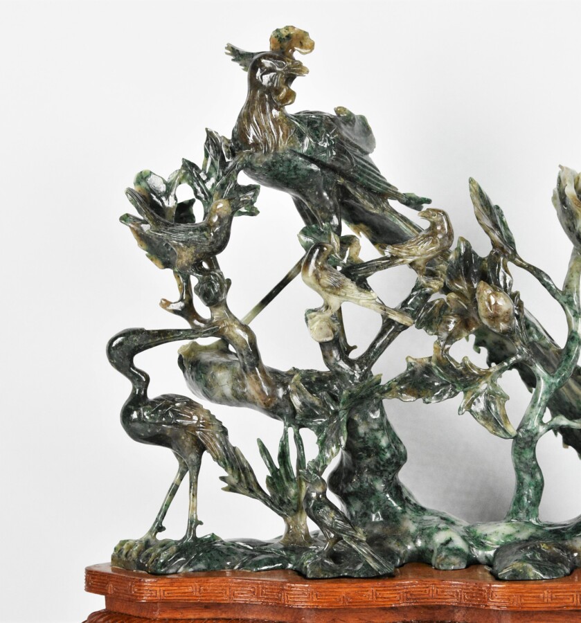 Groupe d'oiseaux branchés en serpentine sculptée, Chine, 20e siècle, H. 23 cm, L. 28 cm (sur son socle en bois).