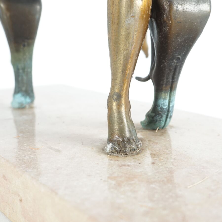 Groupe en régule à plusieurs patines, figurant une femme aux lévriers, présenté sur un socle en marbre, signé "Baleste" sur le socle, H. 43 cm. L. 41 cm (coulures et traces, oxydations, signature possiblement apocryphe).