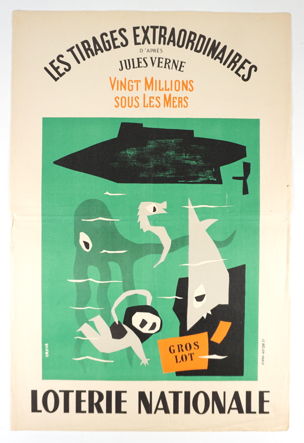 GROVE - Les tirages extraordinaires d'après Jules Verne. Vingt millions sous les mers. Loterie Nationale - Paris ; Le Bélier, 1956 - 1 affiche couleurs signée dans le dessin en bas à gauche - 60x40 cm - Traces de pliures, 1 très petit trou avec perte en marge droite, 1 déchirure restaurée au papier adhésif au verso en marge gauche, quelques micros déchirures en marge - Bon état.