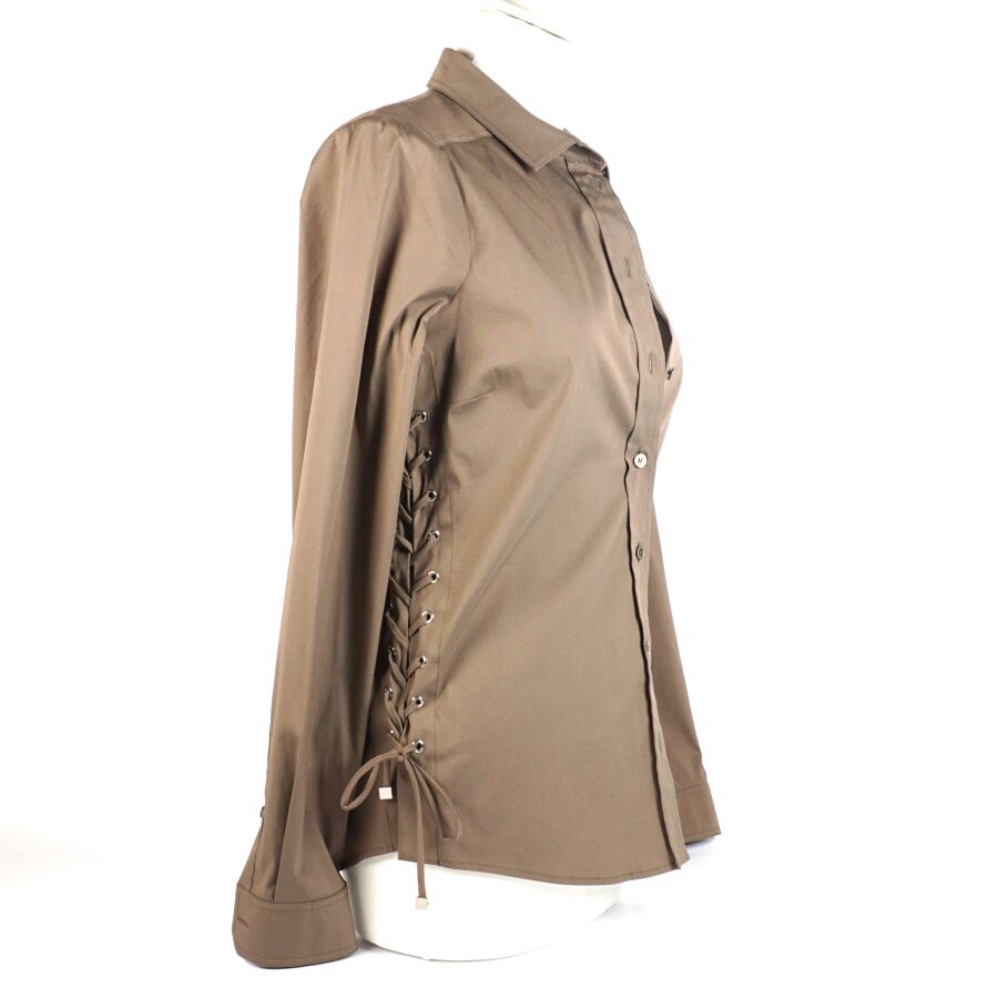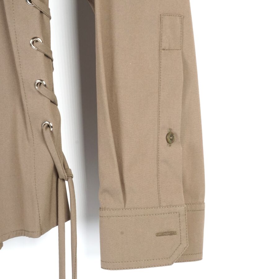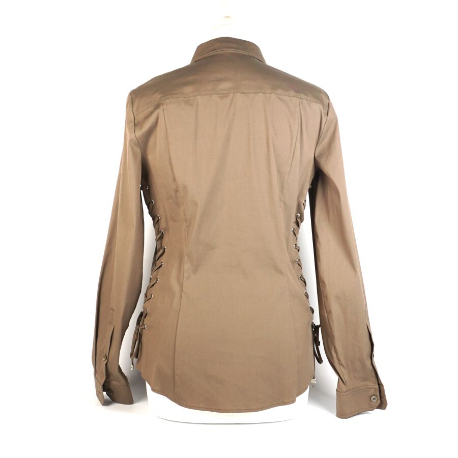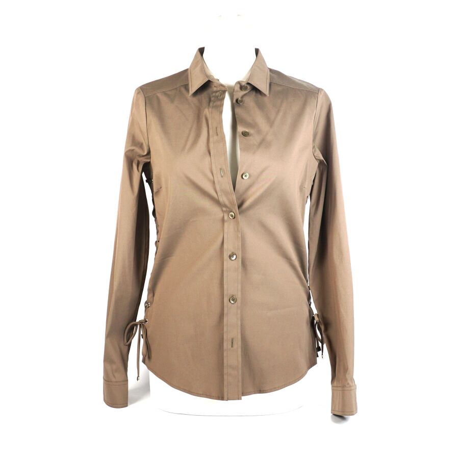 GUCCI : Chemisier en coton et polyamide de couleur vert olive - marron clair, fermeture à l'avant par 8 boutons nacrés logotés, taille à lacets, manches longues fermant par deux boutons, étiquette intérieure, taille indiquée 42, L. Totale : 68.5 cm.