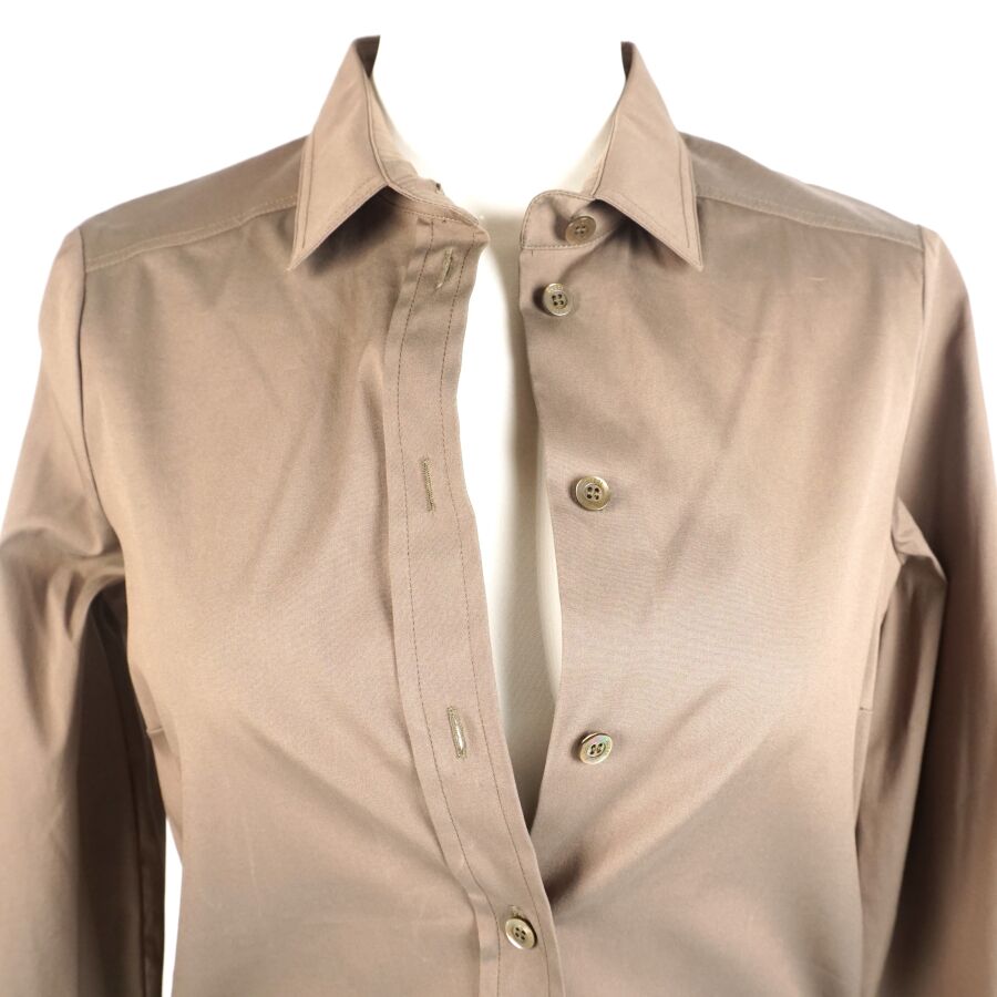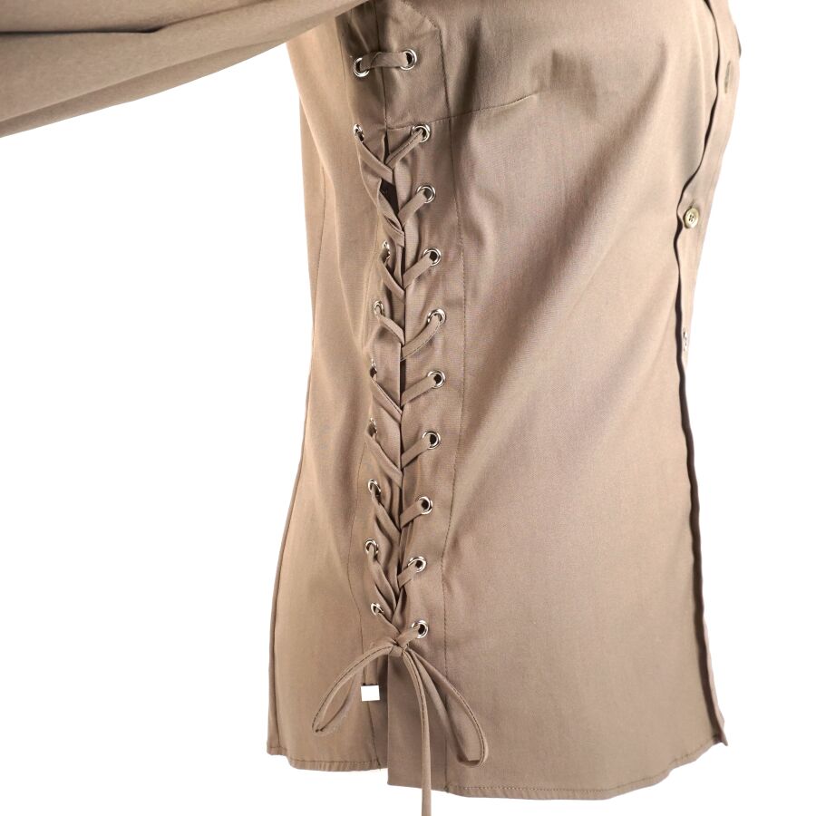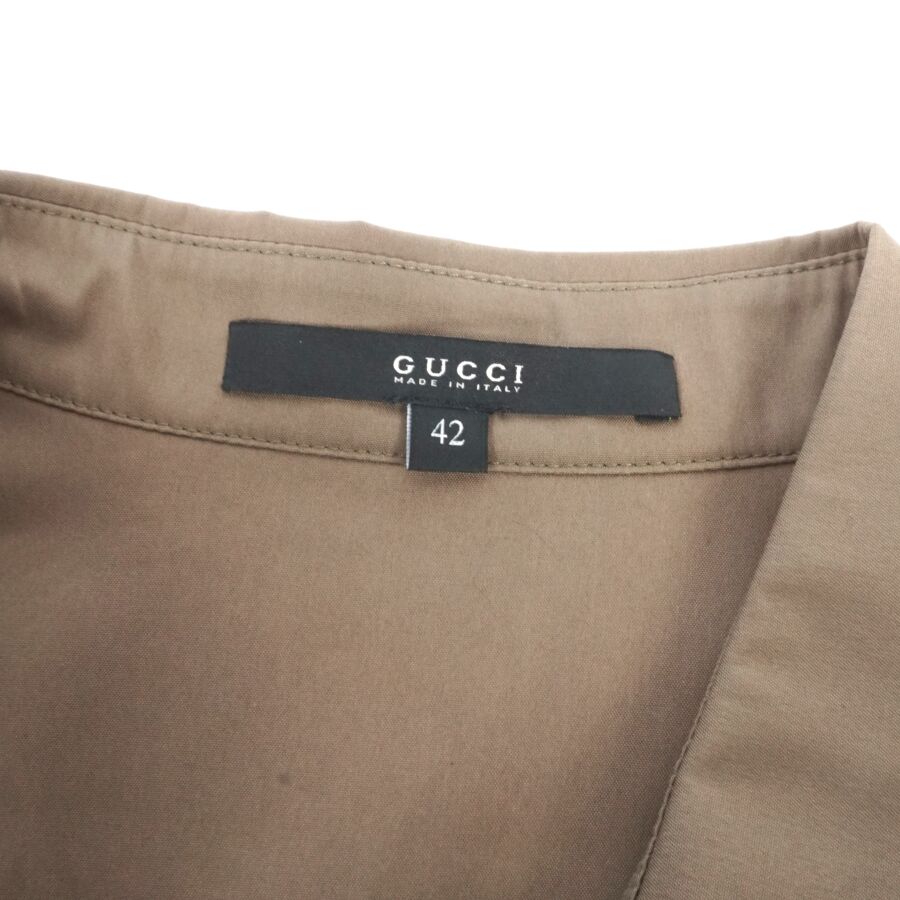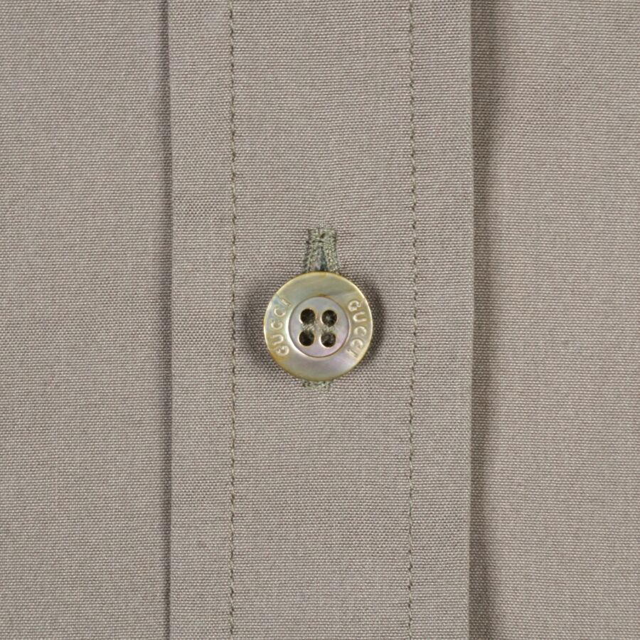 GUCCI : Chemisier en coton et polyamide de couleur vert olive - marron clair, fermeture à l'avant par 8 boutons nacrés logotés, taille à lacets, manches longues fermant par deux boutons, étiquette intérieure, taille indiquée 42, L. Totale : 68.5 cm.