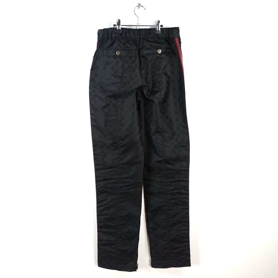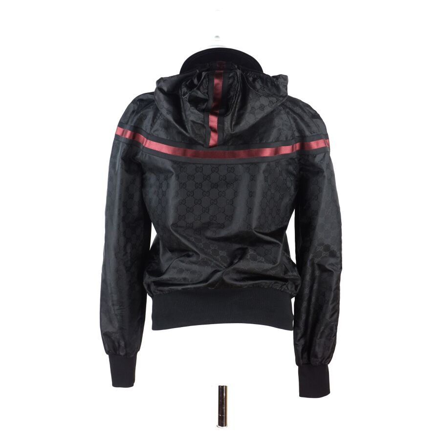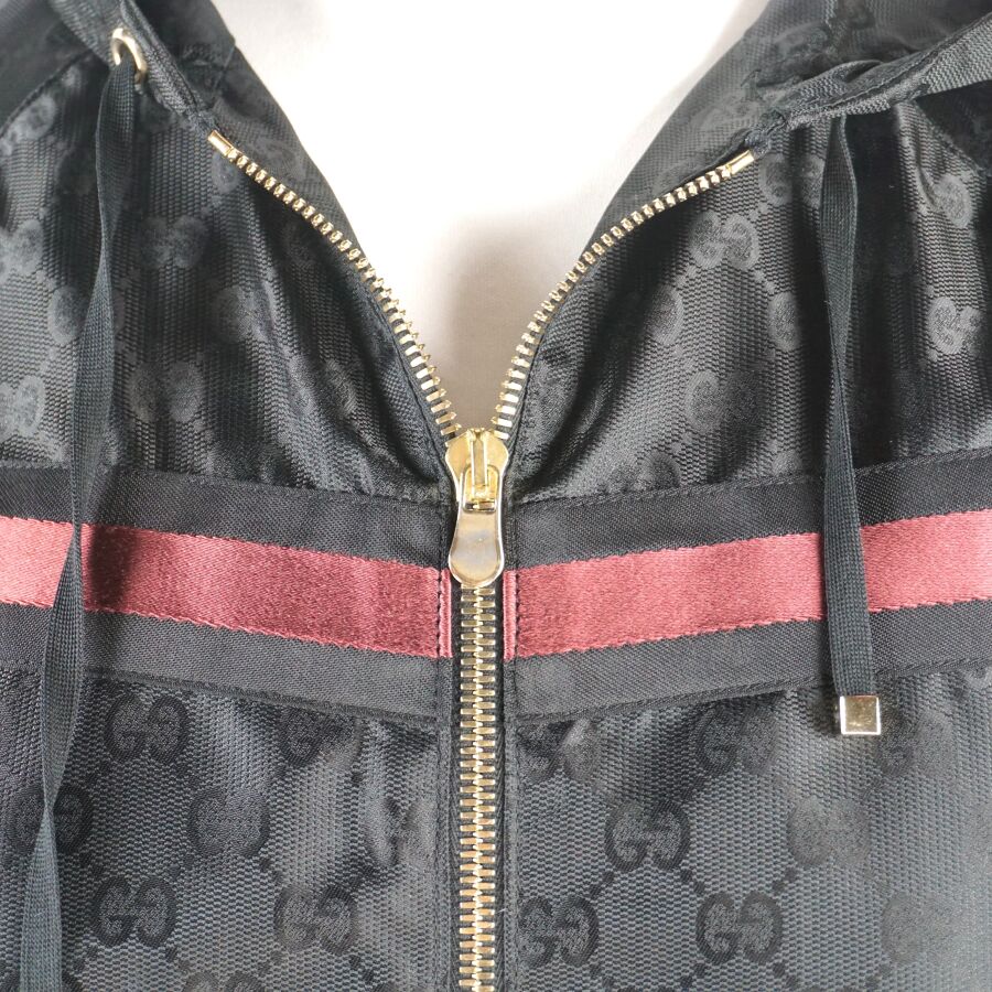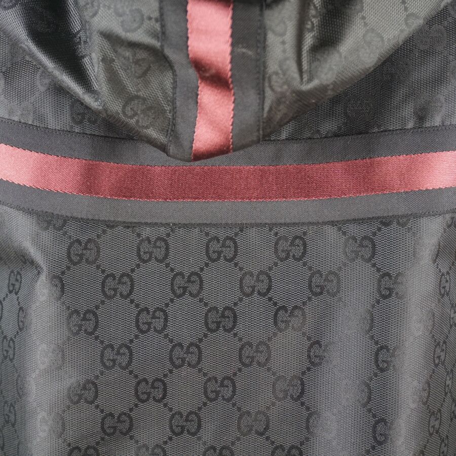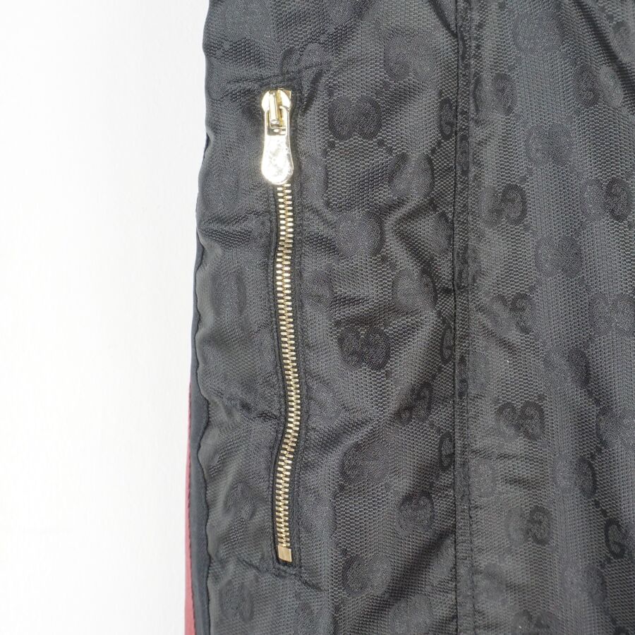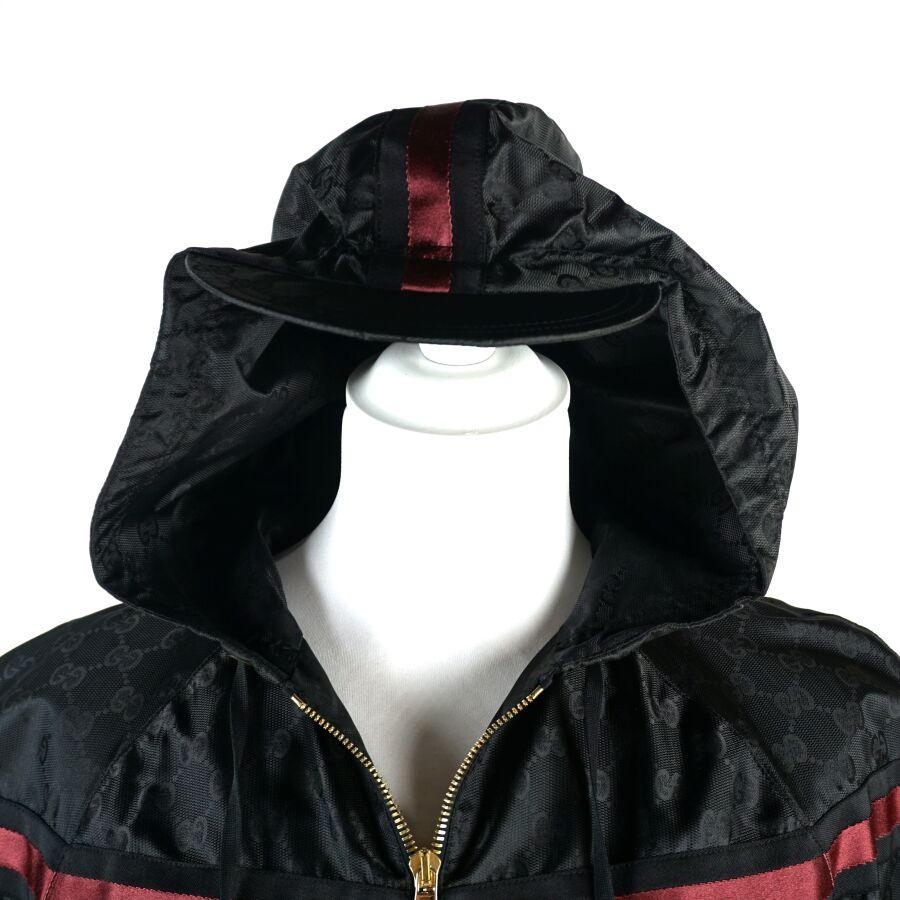 GUCCI : Ensemble comprenant une veste à motif monogrammé noir sur fond noir et bandes de couleur bordeaux, fermeture principale zippée, deux poches latérales zippées, avec sa capuche formant casquette, et son pantalon, coupe droite, fermeture à la taille par un bouton pression et une fermeture zippée, deux poches latérales à fermeture zippée, étiquettes intérieures, taille supposée S, L. Totale (Veste - Hors capuche) : 57 cm. L. Totale (Pantalon) : 102.5 cm Larg. Taille : 35.5 cm.