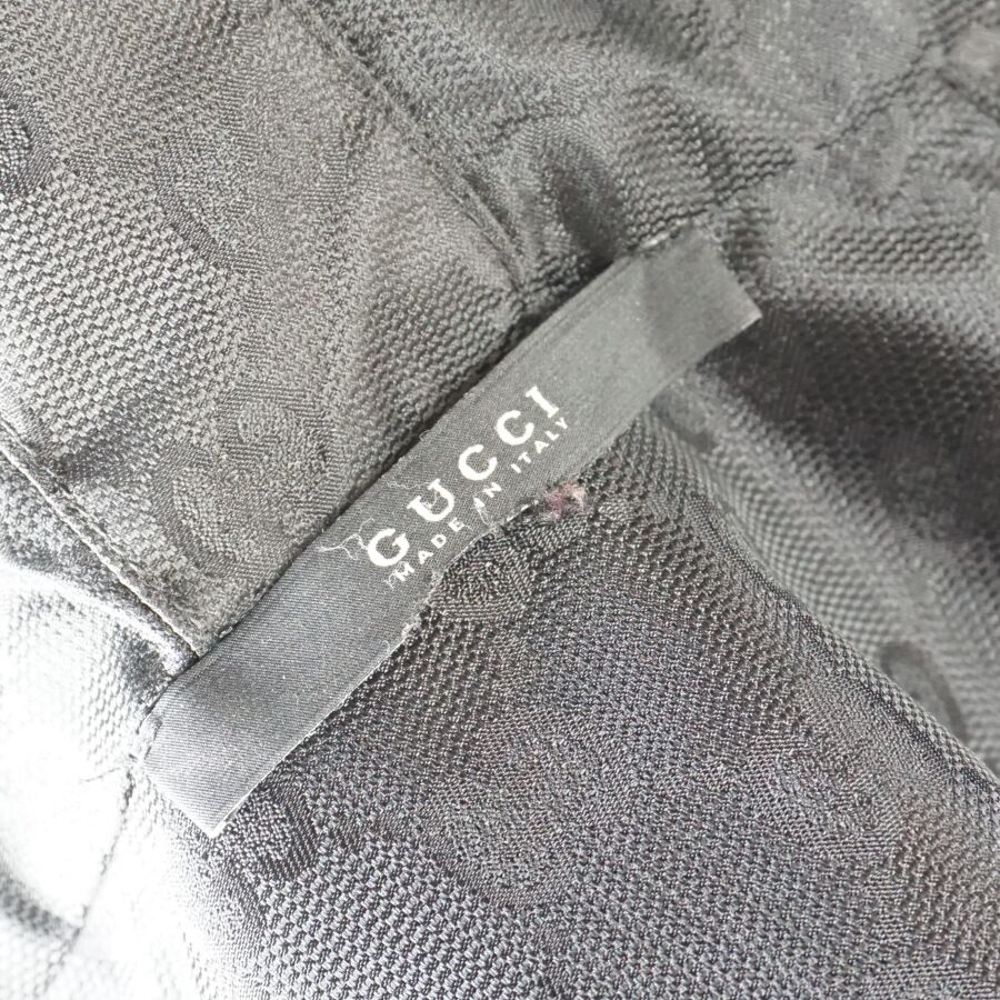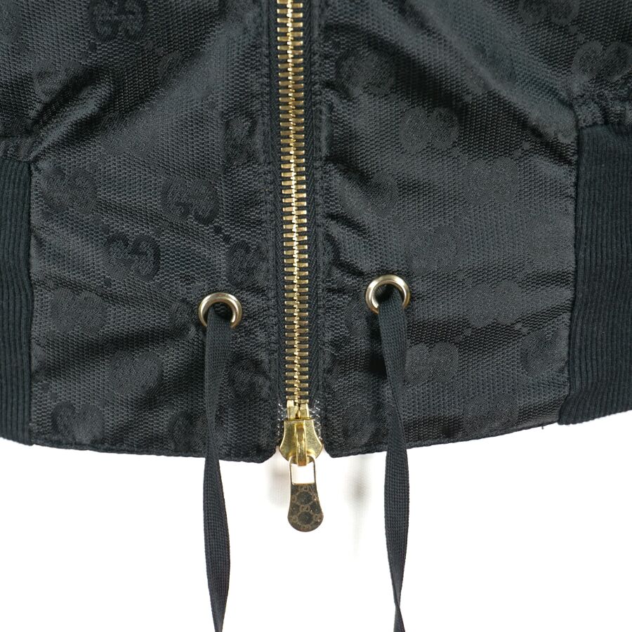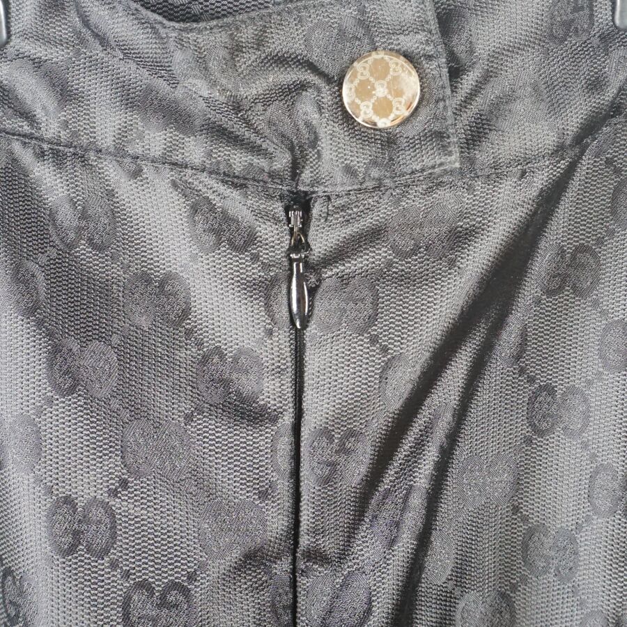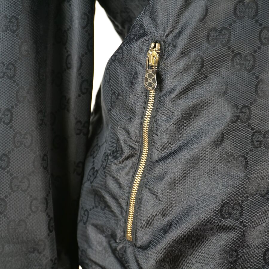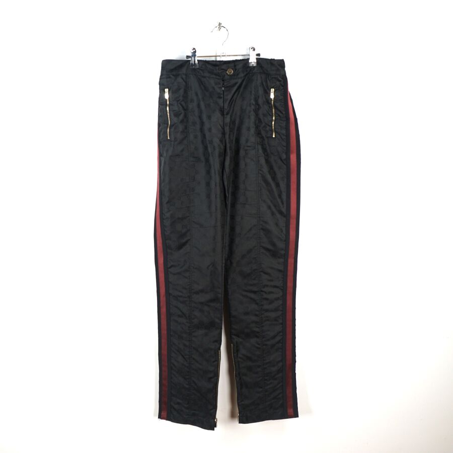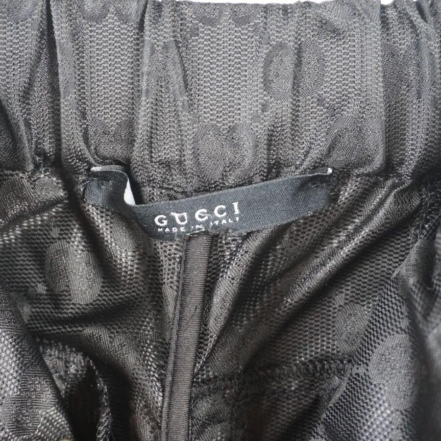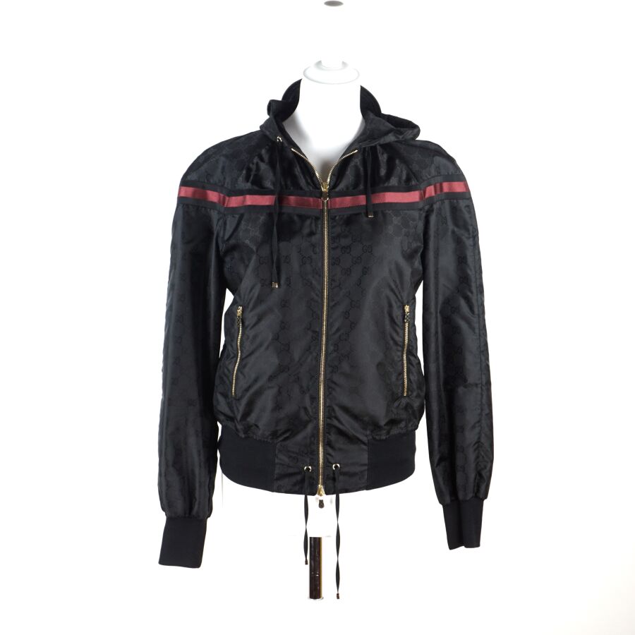 GUCCI : Ensemble comprenant une veste à motif monogrammé noir sur fond noir et bandes de couleur bordeaux, fermeture principale zippée, deux poches latérales zippées, avec sa capuche formant casquette, et son pantalon, coupe droite, fermeture à la taille par un bouton pression et une fermeture zippée, deux poches latérales à fermeture zippée, étiquettes intérieures, taille supposée S, L. Totale (Veste - Hors capuche) : 57 cm. L. Totale (Pantalon) : 102.5 cm Larg. Taille : 35.5 cm.