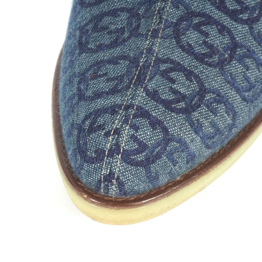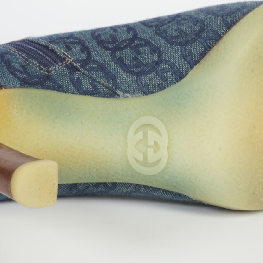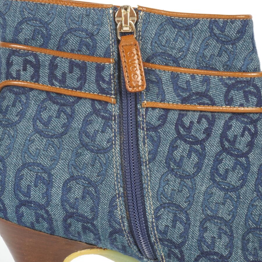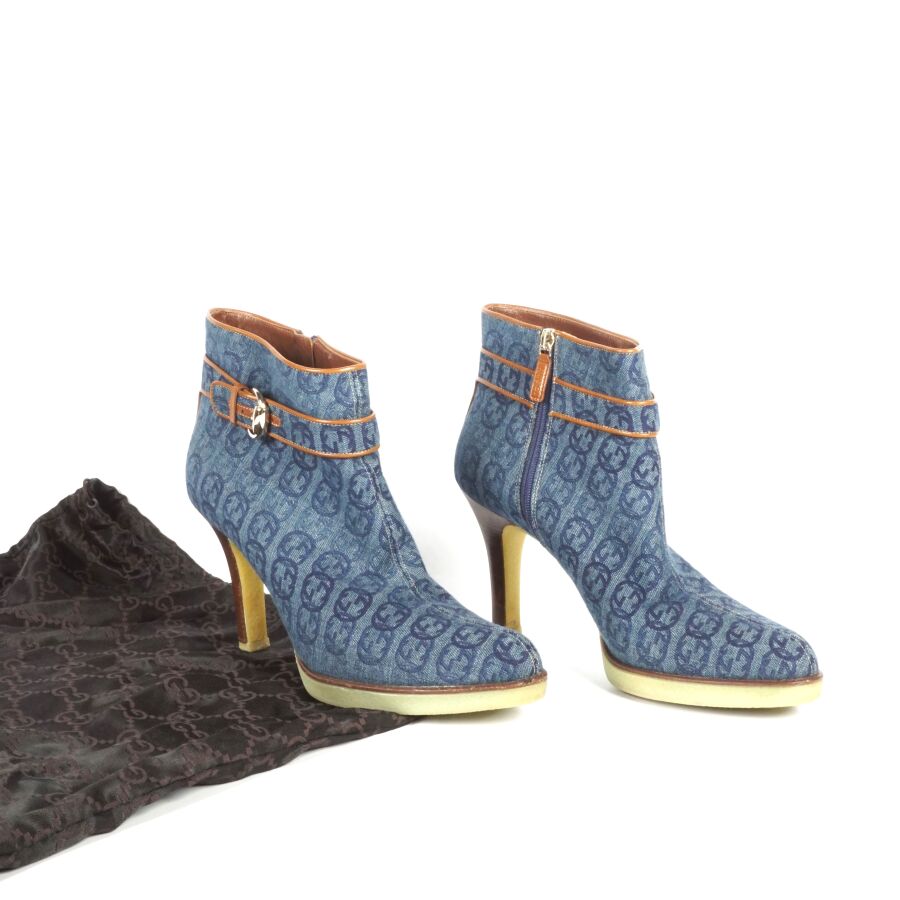 GUCCI : Paire de bottines en toile monogrammée bleu effet jean et cuir lisse marron, ornées d'une boucle ardillon, fermeture zippée latérale, taille indiquée 39 1/5, numérotées, présentée en dustbag d'origine (petites usures d'usage).