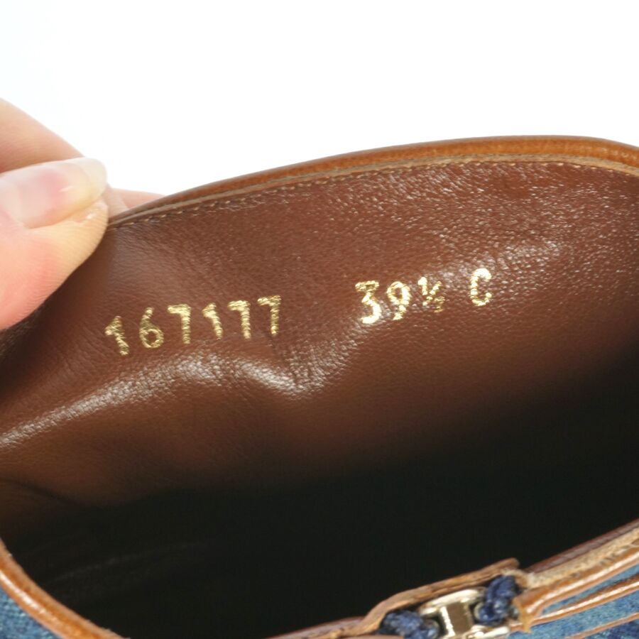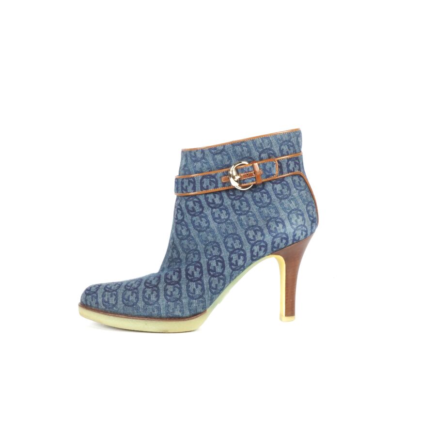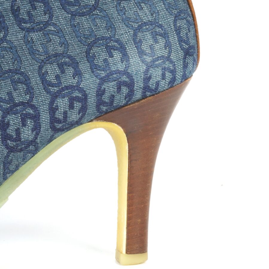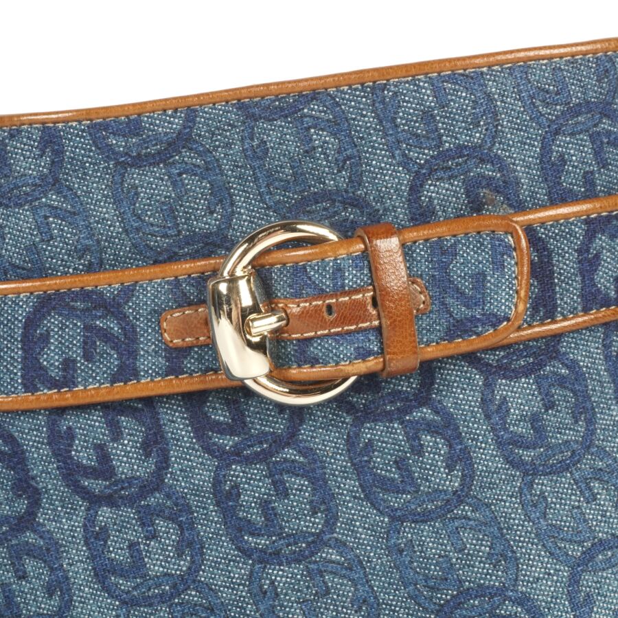 GUCCI : Paire de bottines en toile monogrammée bleu effet jean et cuir lisse marron, ornées d'une boucle ardillon, fermeture zippée latérale, taille indiquée 39 1/5, numérotées, présentée en dustbag d'origine (petites usures d'usage).
