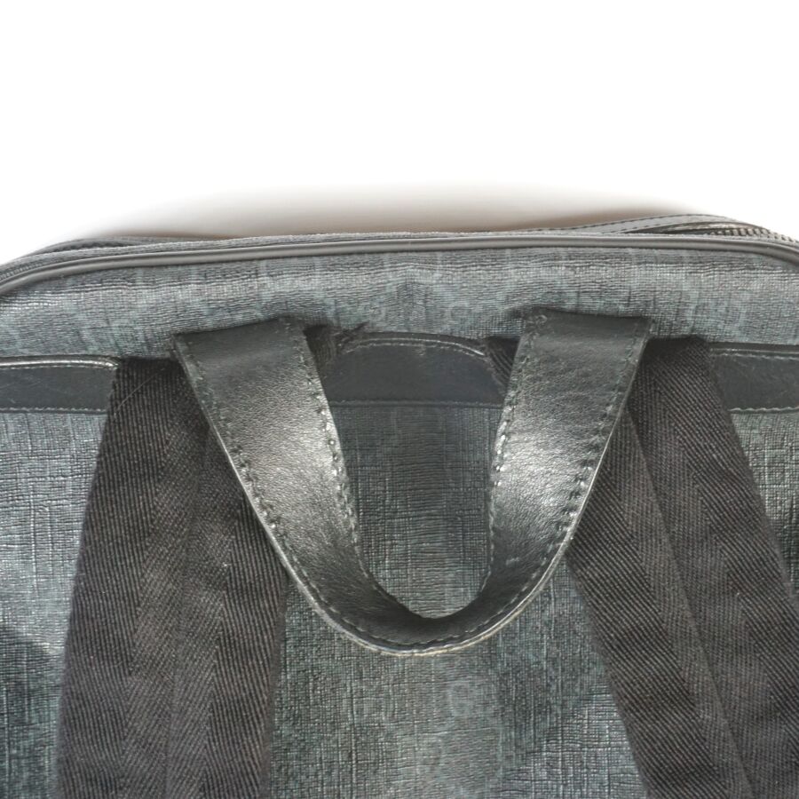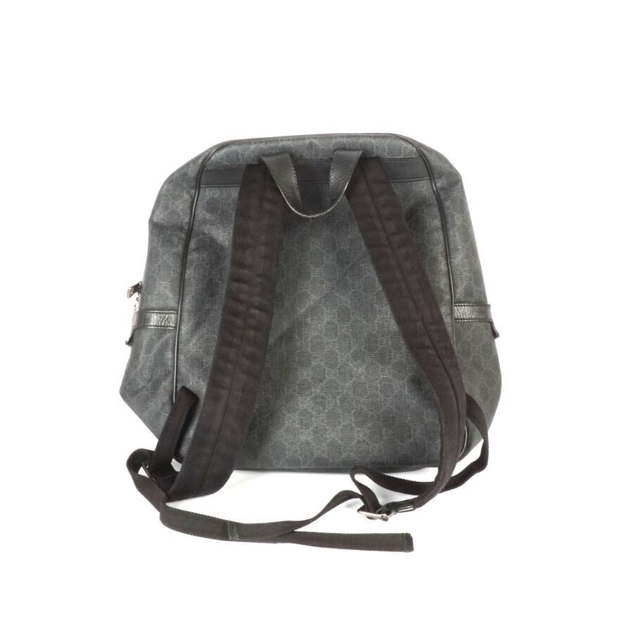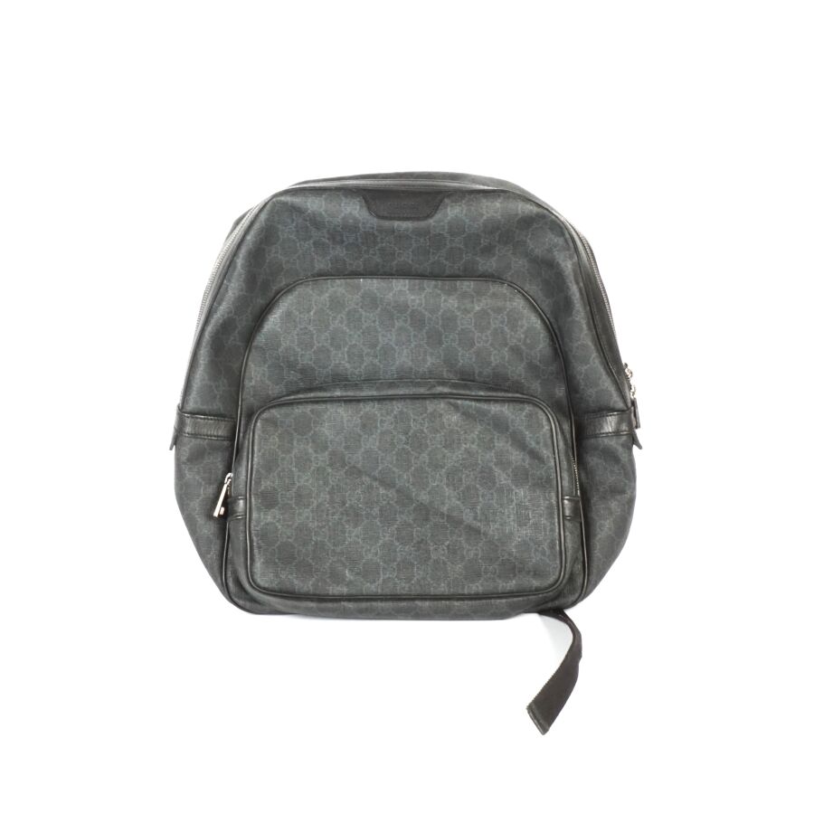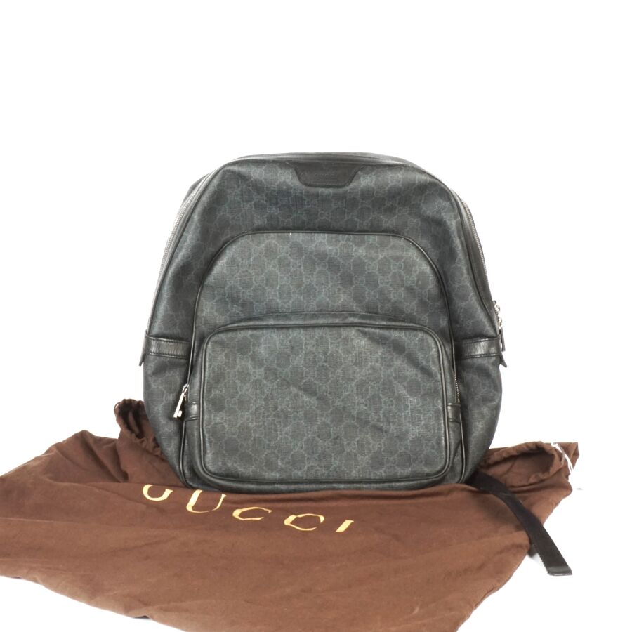 GUCCI : Sac à dos en cuir lisse de couleur noire et toile enduite monogrammée à motif noir sur fond gris foncé, fermeture principale zippée, une anse supérieure en cuir noir, pochette extérieure à l'avant zippée, intérieur en tissu noir, pochette interne zippée avec plaque en cuir logotée et numérotée, avec ses bretelles noires réglables, présenté dans son dustbag d'origine et avec sa carte de la Maison, Dim. 40 x 38 x 15.5 cm (bel état).