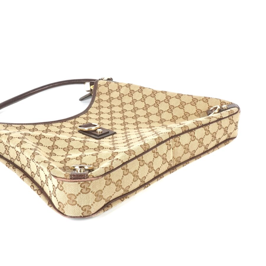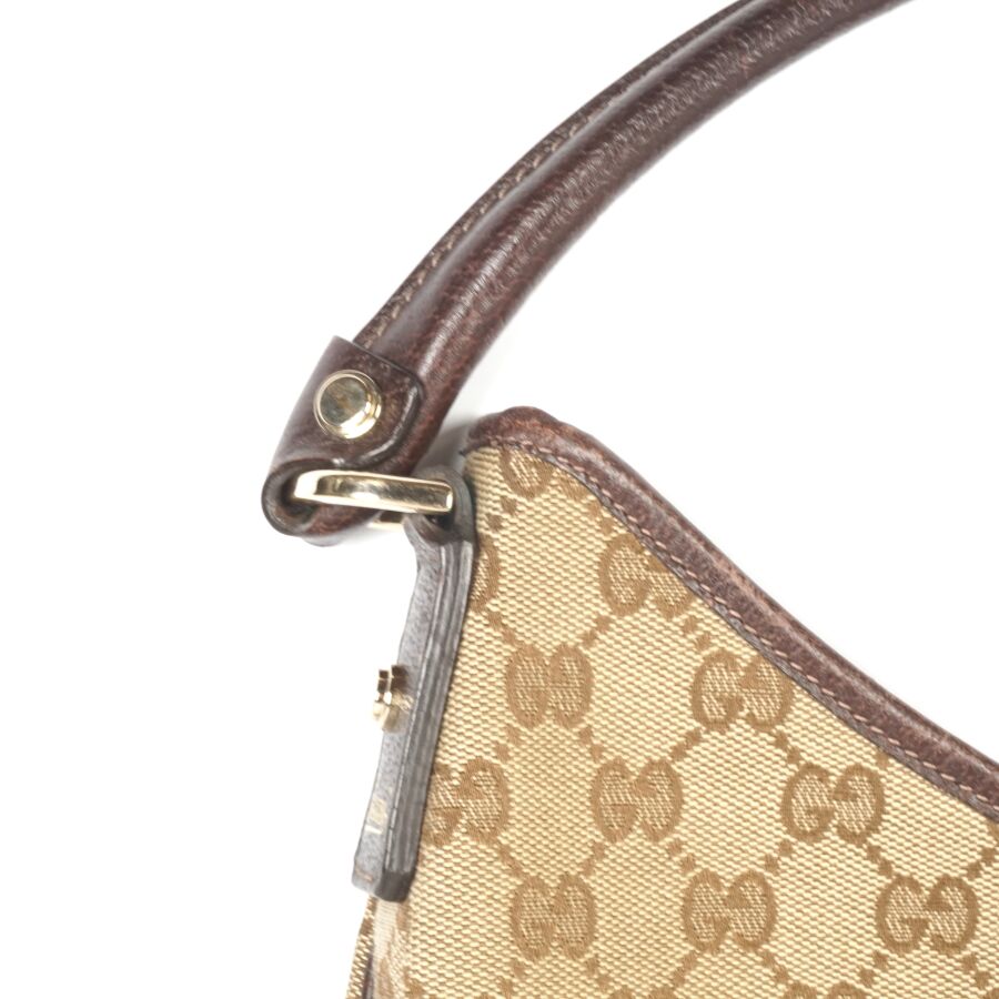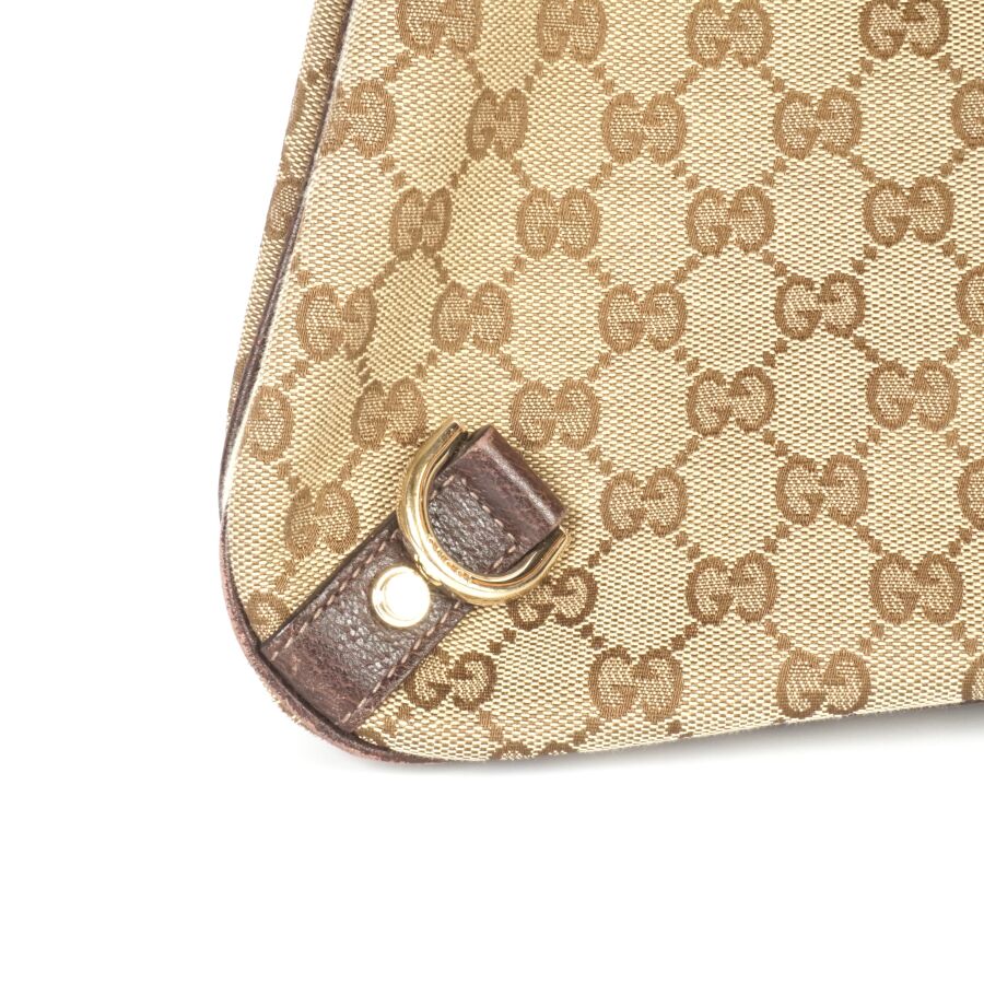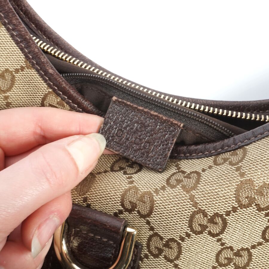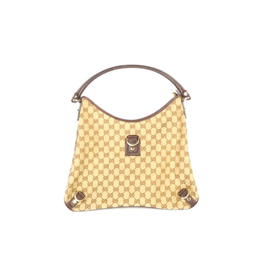 GUCCI : Sac à main en cuir grainé marron foncé et toile monogrammée beige et marron, bijouterie en métal doré, fermeture principale zippée logotée, une anse supérieure en cuir pour un porté main, intérieur en tissu marron, pochette interne latérale avec fermeture zippée et plaque en cuir logotée et numérotée, présenté avec son dustbag d'origine, Dim. Hors anse : 31.5 x 37 x 5.8 cm (quelques usures d'usage et traces).