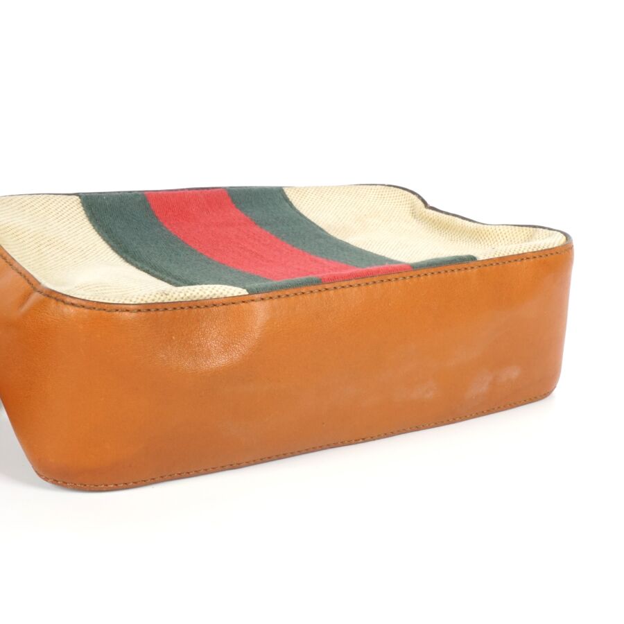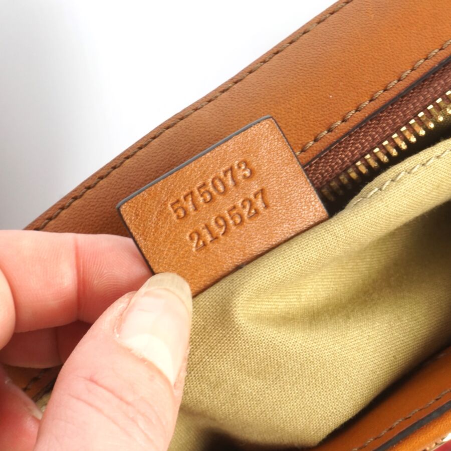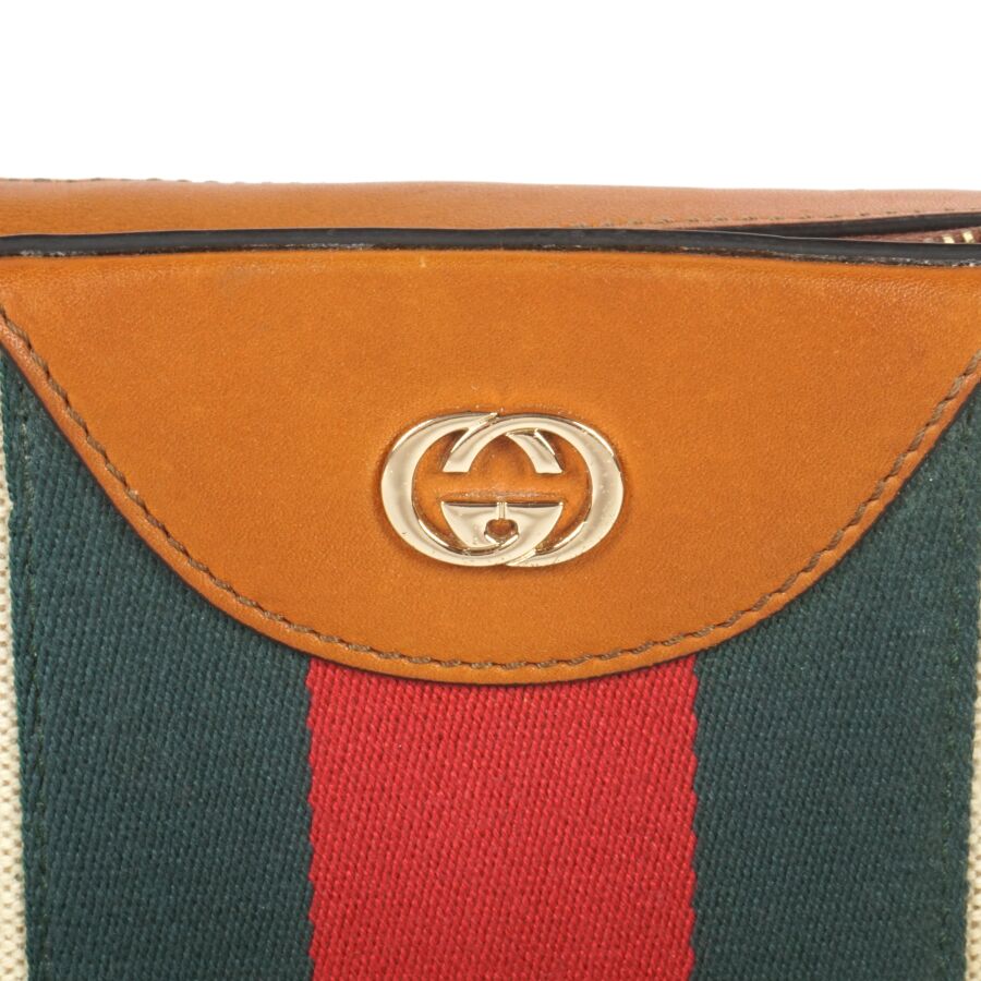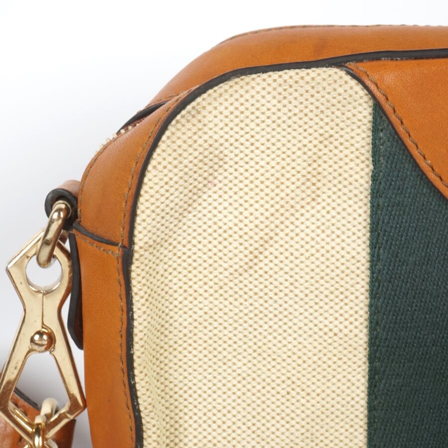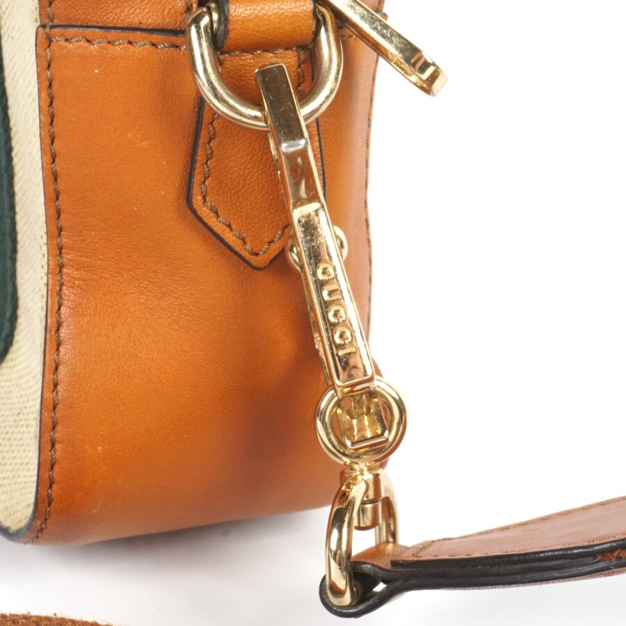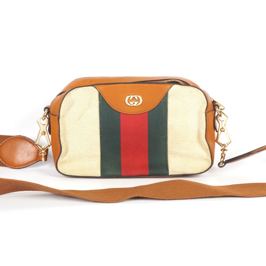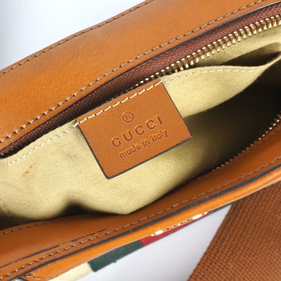 GUCCI : Sacoche en cuir lisse marron clair et toile beige à bandes vertes et rouge, ornée sur une face du double monogramme en métal doré, fermeture zippée, intérieur beige-vert avec une pochette latérale, plaque en cuir logotée et numérotée, avec sa bandoulière en cuir et tissu marron, attaches détachables en métal doré logoté, Dim. 13.5 x 22 x 6.5 cm (petites traces et usures d'usage légères).