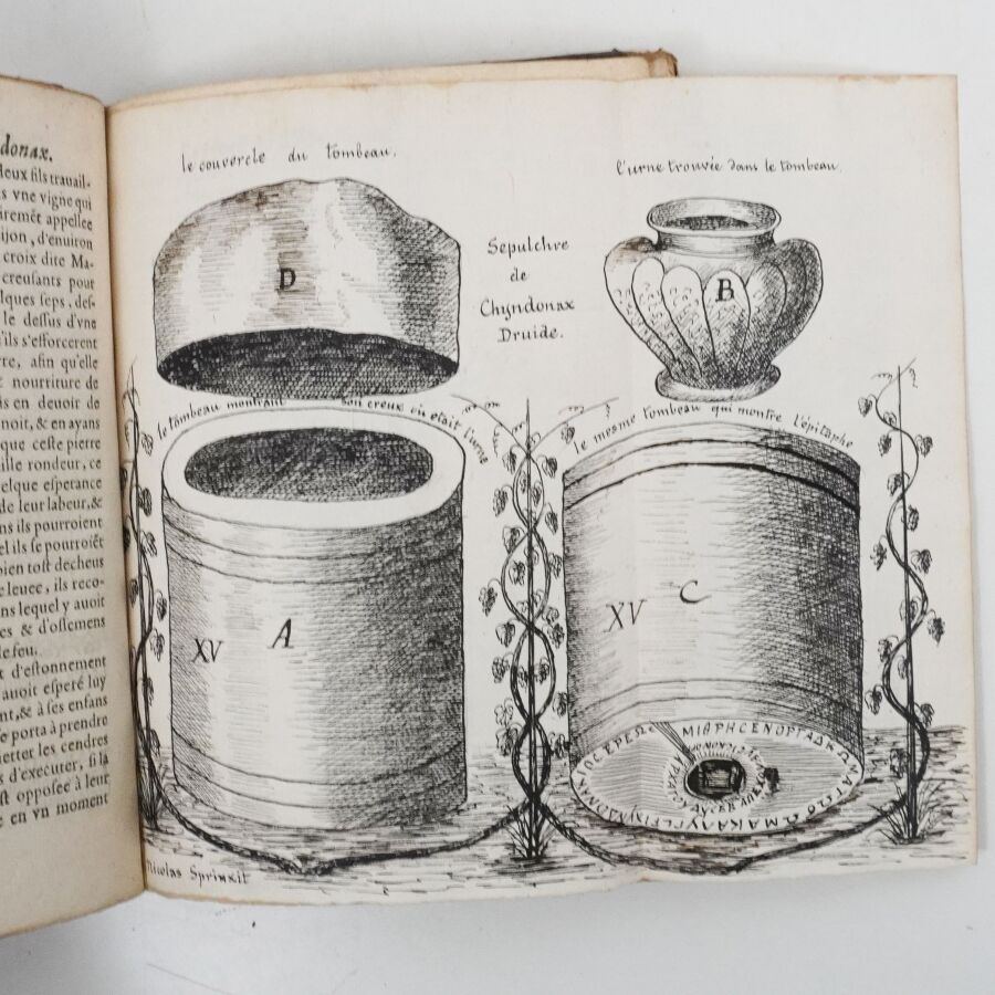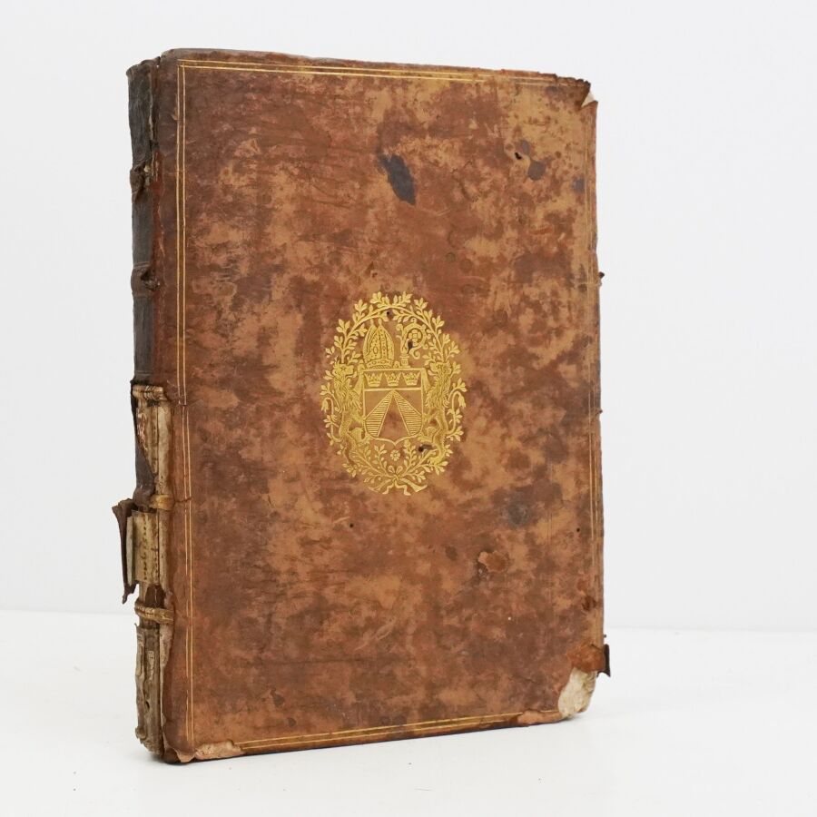 L'édition est illustrée des armes du dédicataire gravées en taille-douce à pleine page, d'une planche dépliante gravée également en taille-douce représentant le tombeau et l'urne (manquant ici, remplacée par une copie dessinée à l'encre et manuscrite), ainsi que de quelques gravures sur bois dans le texte. Marge d'un feuillet déchiré avec manque, sans perte de texte. Aux armes de de Léonor d'Estampes de Valençay (1589-1651), évêque de Chartres de 1620 à 1641, puis archevêque de Reims de 1641 à sa mort). (O.H.R. 1663, fer n°3).