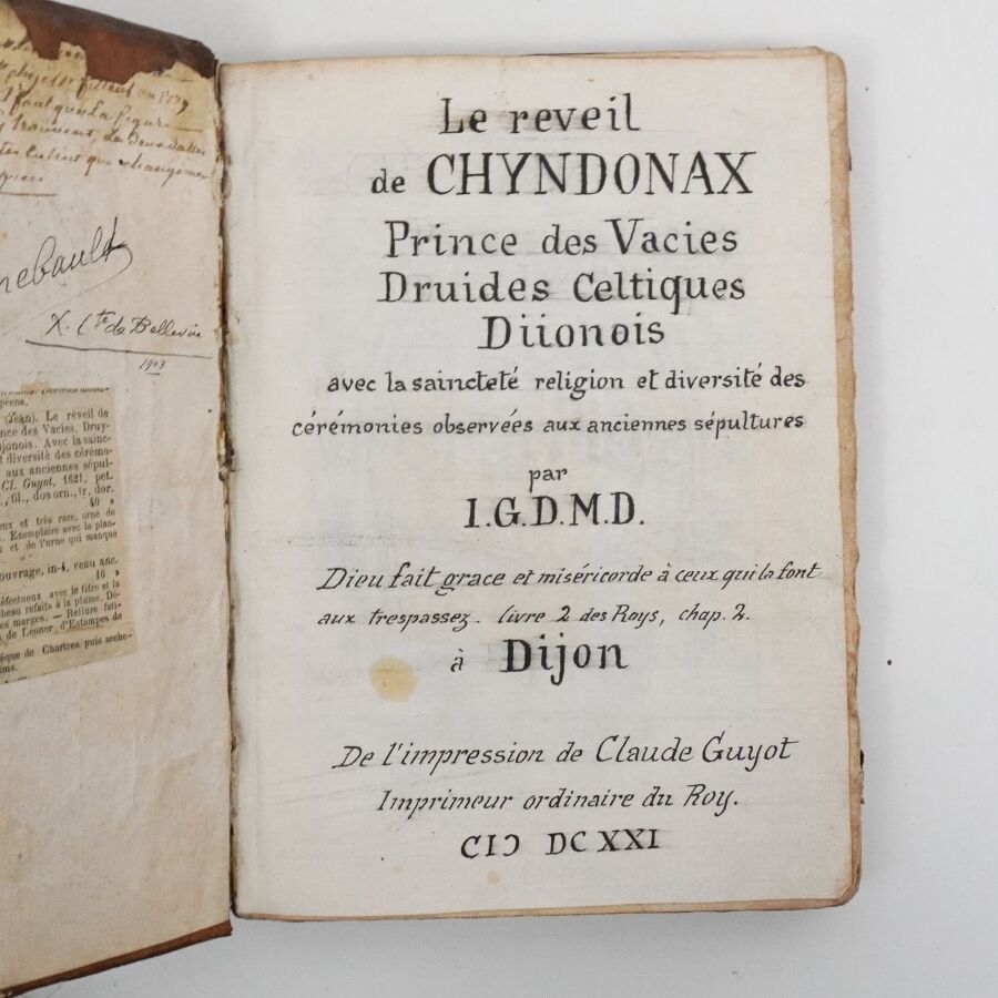 [GUÉNEBAULD (Jean)]. Le Réveil de Chyndonax, prince des Vacies, druydes celtiques dijonois, avec la saincteté, religion, & diversité des Cérémonies observées aux anciennes sépultures par I.G.D.M.D. [Dijon], [De l'impression de Claude Guyot], 1621. Petit in-4 veau havane, dos à nerfs orné, double filet doré encadrant les plats ornés d'armes dorées (reliure du 18e siècle). Reliure très usagée avaec manques de cuir.