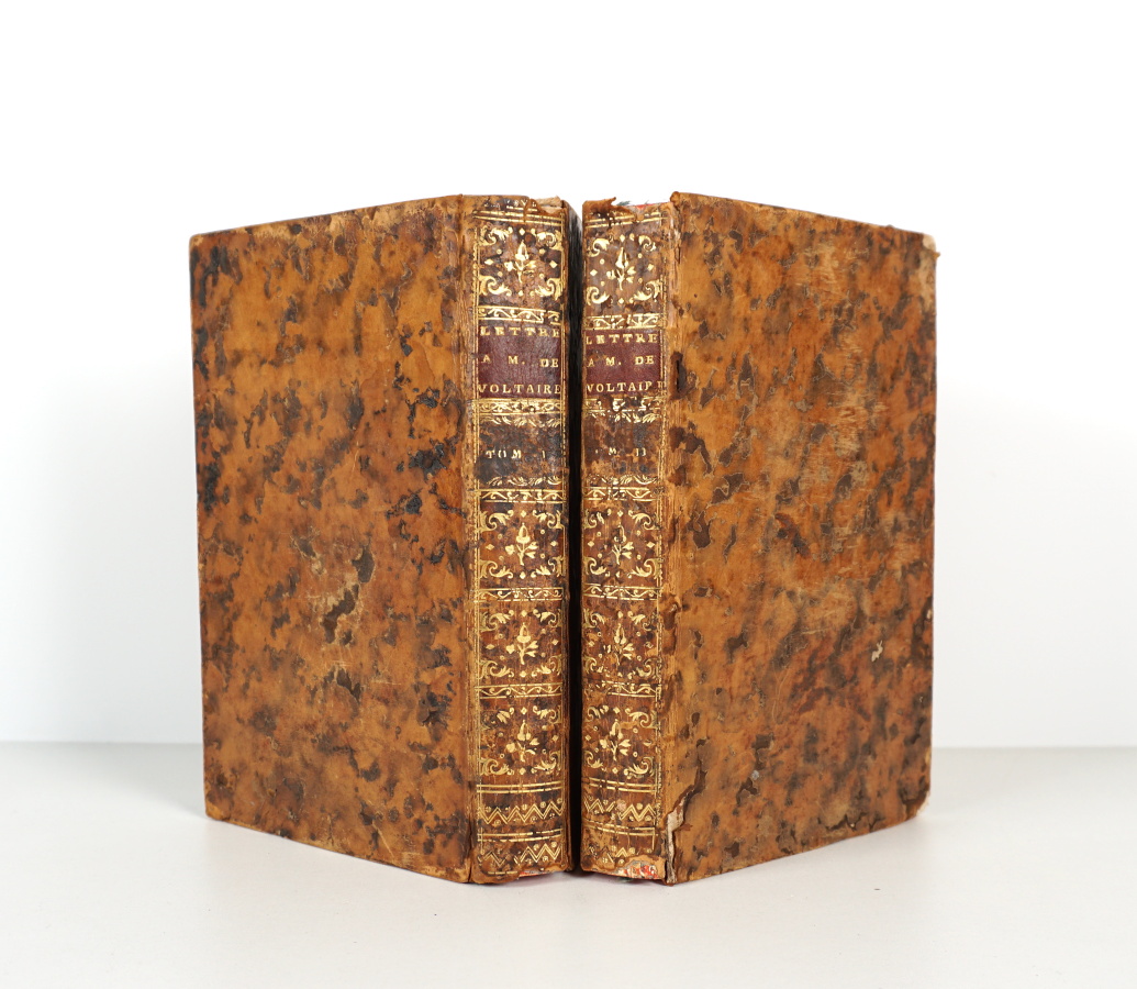 [GUENÉE (Antoine, abbé)] - Lettres de quelques juifs portugais et allemands, à M. de Voltaire. Avec des réflexions critiques, et un petit commentaire extrait d'un plus grand - Paris ; Moutard, 1772 - 2 volumes In-8° - [4], XX, 473, [3] pages, V, [1], 476 pages - Quelques pâles auréoles en marge au tome I - Reliure de l'époque veau havane granité (des manques aux 1ers plats, 1er mors du tome I fendu, des coins usés) - Dos lisses ornés et tomés or (quelques dédorures, accidents en coiffes supérieures, coiffes inférieures arasées) - Pièces de titre maroquin brun - Tranches rouges - Ex-libris gravé armorié avec devise : " Moderatur et urget " répété aux 2 premiers contre plats.