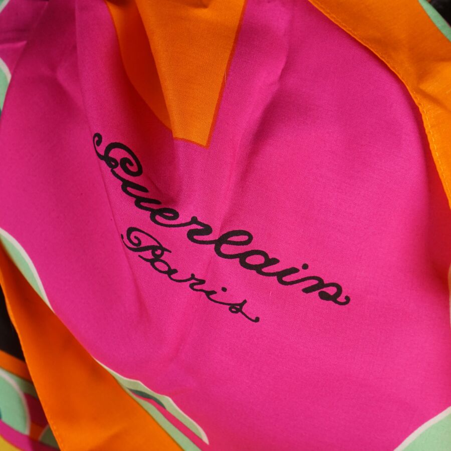 GUERLAIN : Carré de soie à motif de lotus polychromes, signé, 130 x 130 cm.
