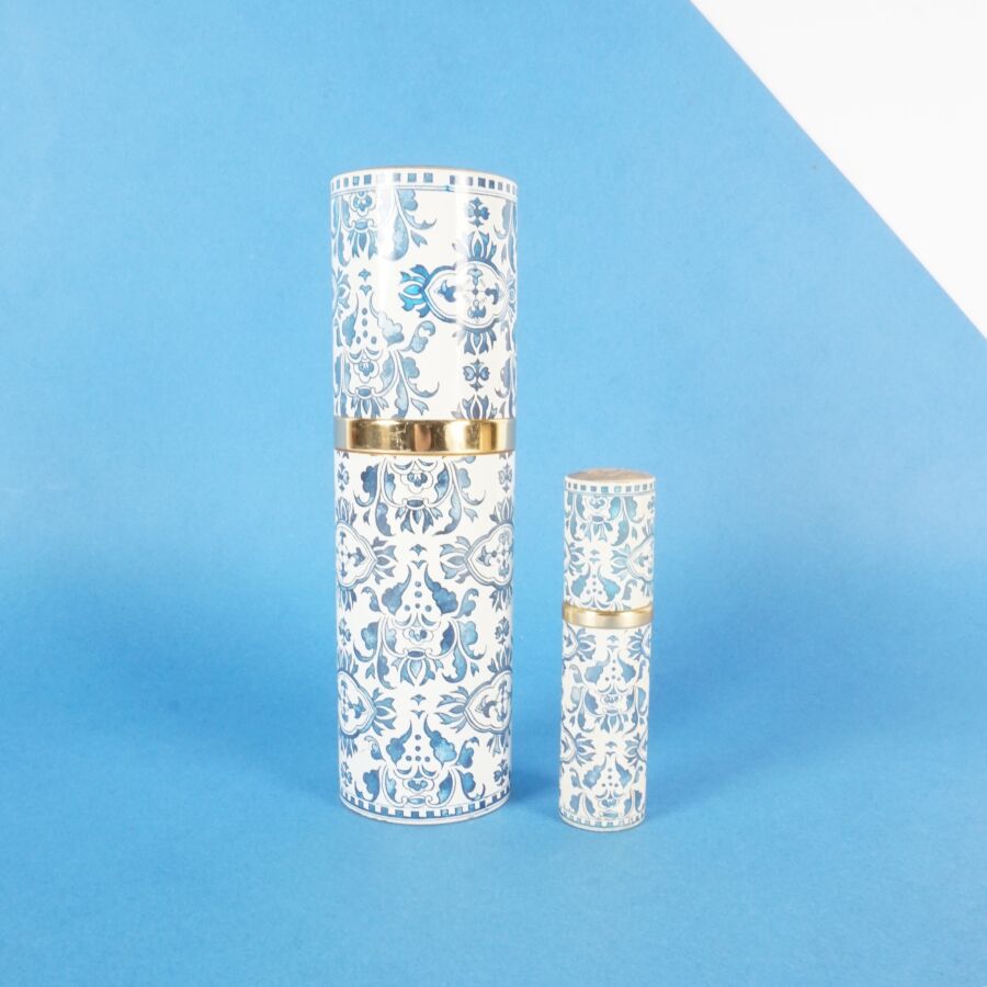 GUERLAIN : Deux vaporisateurs cylindriques, à décor de lambrequins en bleu sur fond blanc, bagues dorées, l'un avec sa recharge interne "Shalimar", H. 16 cm et 9 cm (vides)
