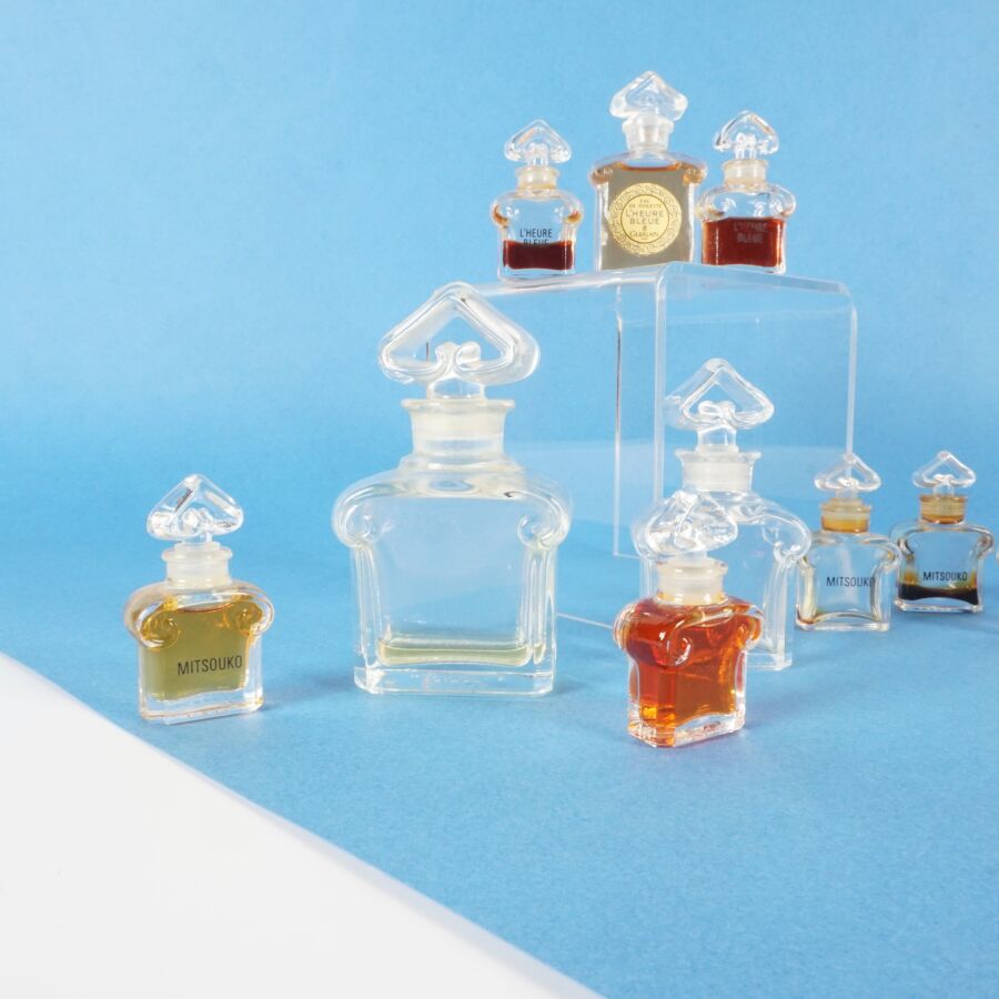 GUERLAIN : Treize miniatures, verre incolore, avec leurs bouchons, comprenant (3) L'heure Bleue, (7) Mitsouko et (3) sans étiquettes, H. 4 cm. H. 5.5 cm. H. 5.7 cm et H. 7.5 cm (certains vides, certains liquides en état d'usage, sans boîte).