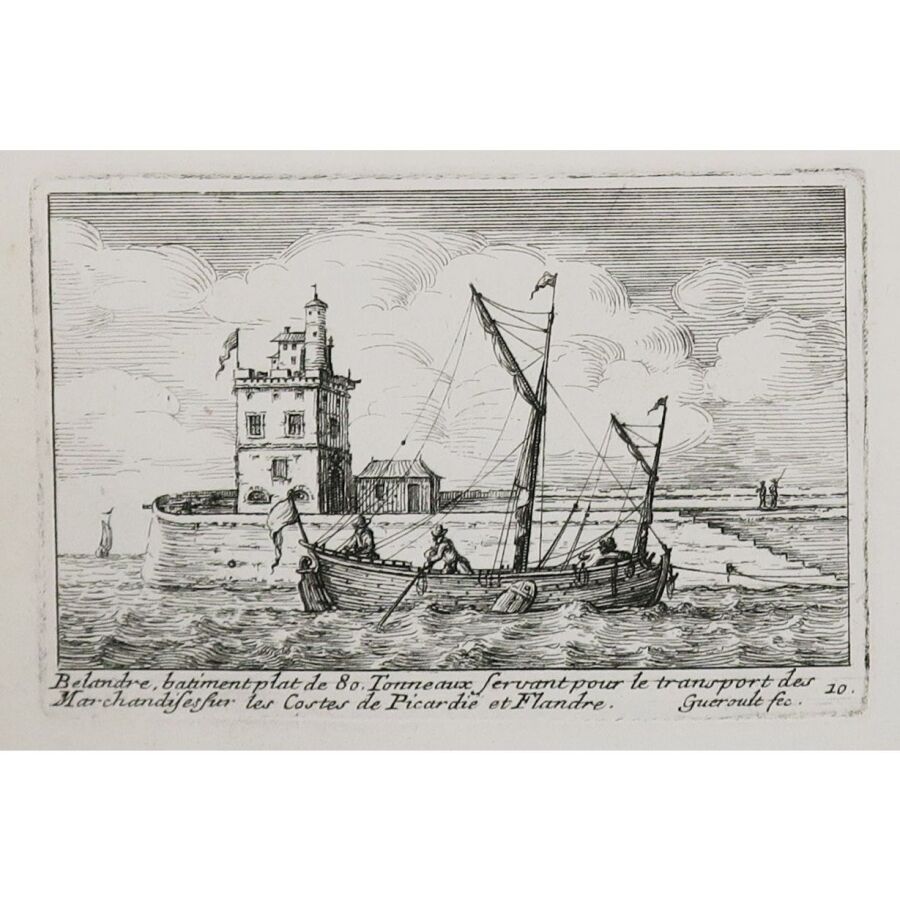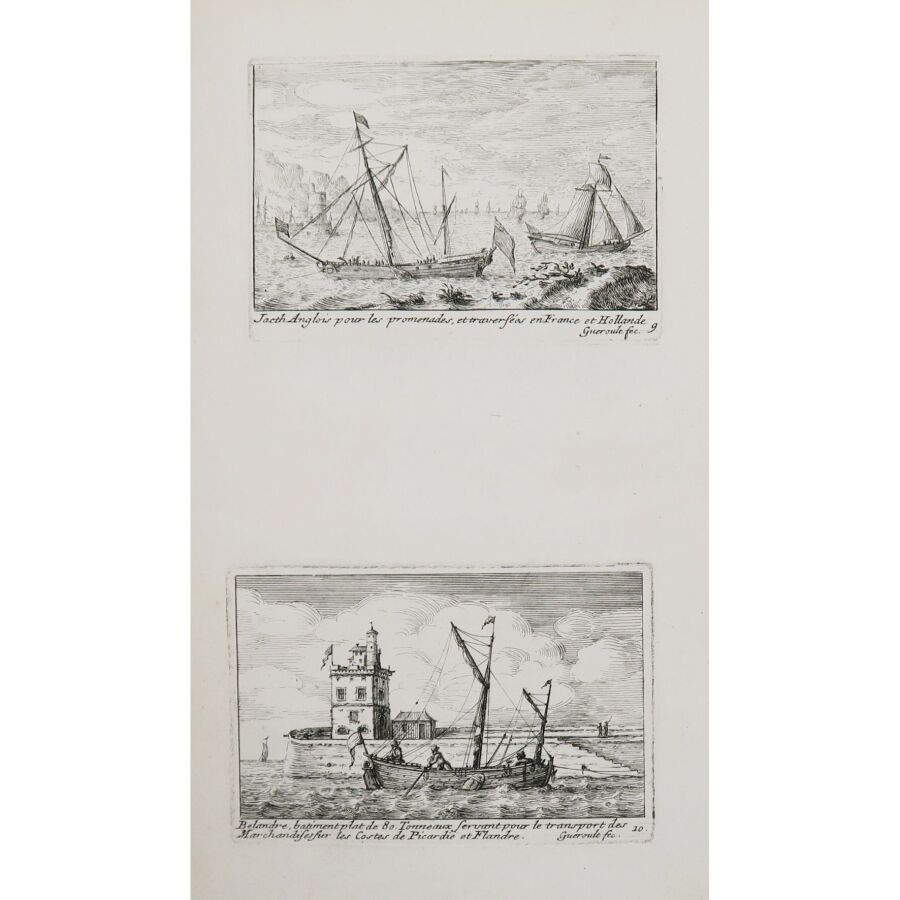 Édition originale, rare, de ce recueil contenant 3 séries d'estampes dessinées d'après nature et gravées par Gueroult du Pas (soit en tout 76 figures y compris les titres-frontispices à raison de 2 par page), représentant différentes sortes de bâtiments tels que ceux qui servent pour la pêche, le négoce et la guerre. (Polak 4163.)