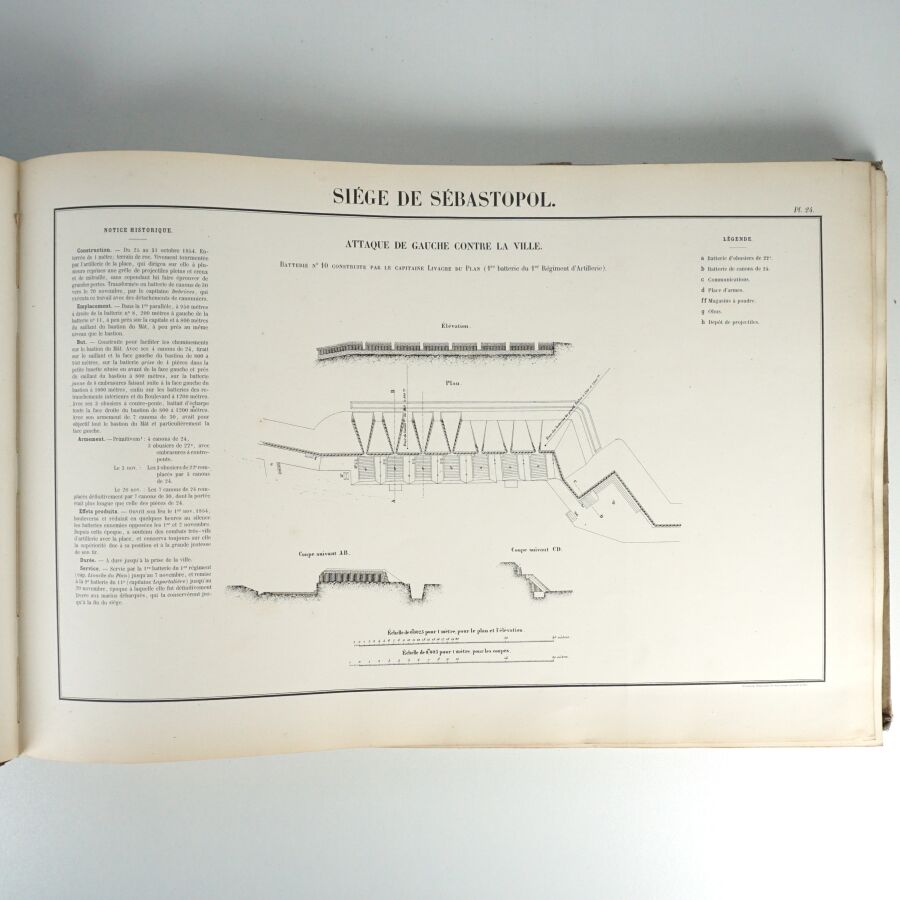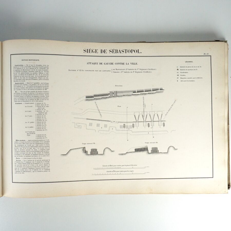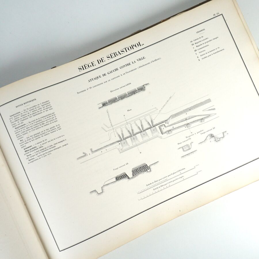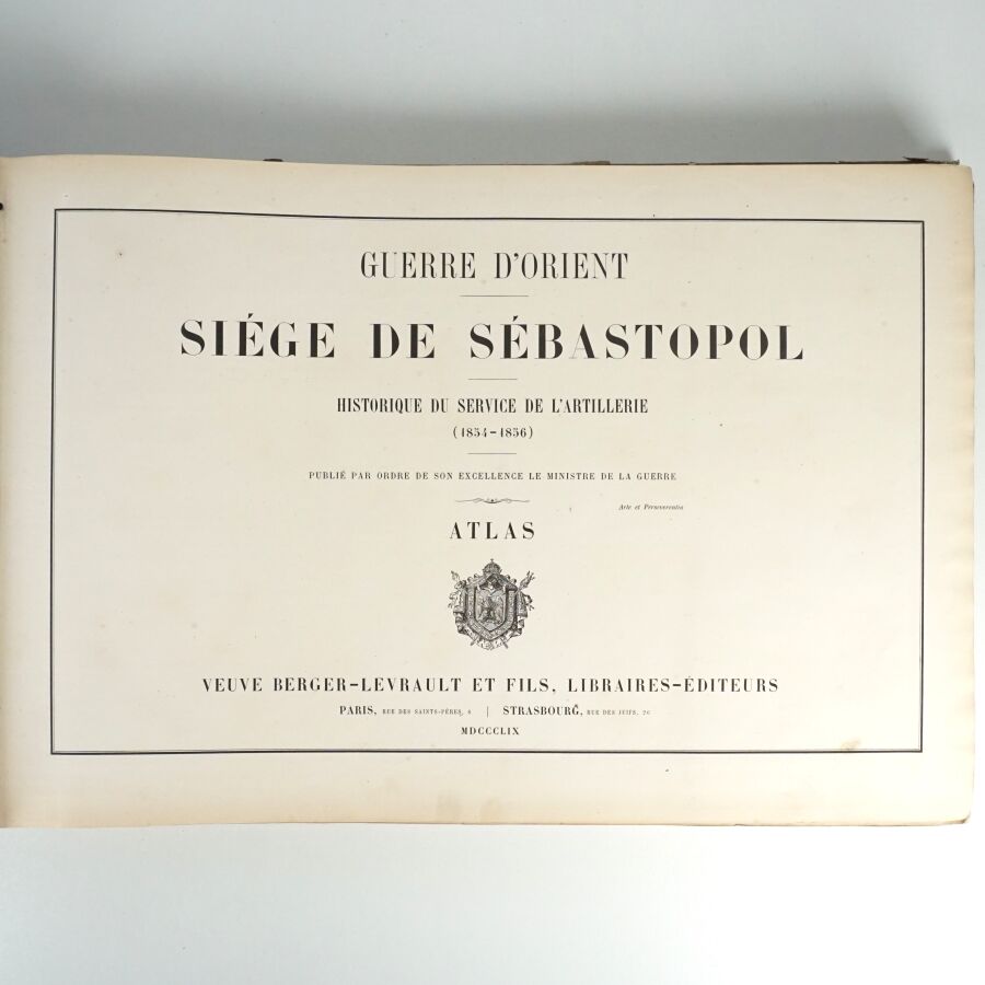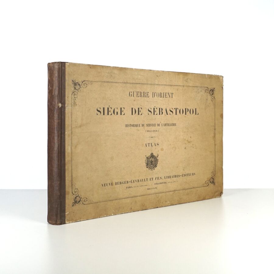 Guerre d'Orient. Siège de Sébastopol. Historique du service de l'artillerie (1854-1856). Atlas. Paris et Strasbourg, Veuve Berger-Levrault et fils, 1859. Grand in-folio oblong bradel demi-toile brune, plat imprimé (reliure usée).