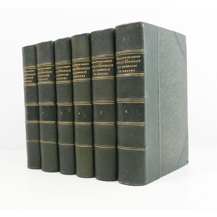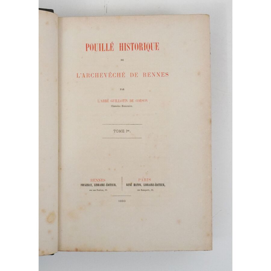 GUILLOTIN de CORSON (Abbé Amédée). Pouillé historique de l'archevêché de Rennes. Rennes, Fougeray, Paris, Haton, 1880-1886. 6 vol. grand in-8, demi-chagrin vert, dos à nerfs orné, titre et tomaison dorés (reliure de l'époque). Ex-libris gravé aux armes de la famille Fournier de Bellevüe. Bon exemplaire.