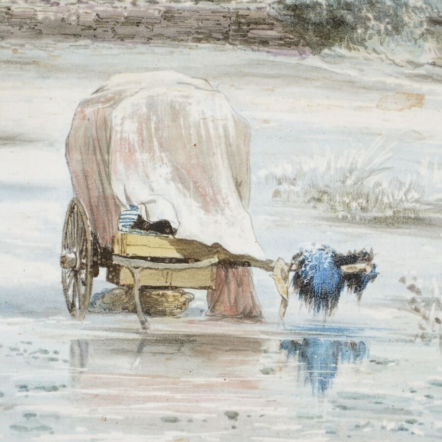 Gustave-Joseph NOEL (1823-1881), "Les ruines du château de Suscinio sous la neige" 1875, plaque de faïence émaillée polychrome au grand feu de four, signée, située et datée 1875 en bas à gauche, tampon au dos, 31 x 70 cm (quelques rayures).