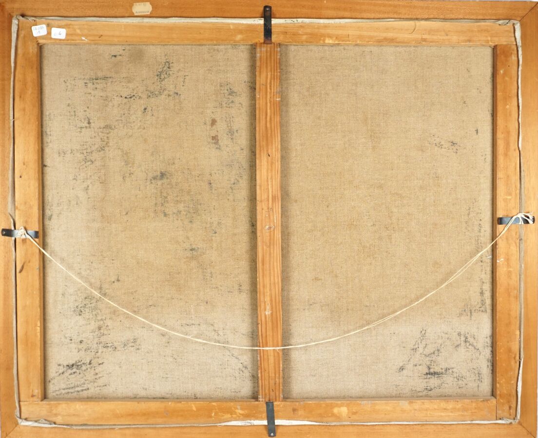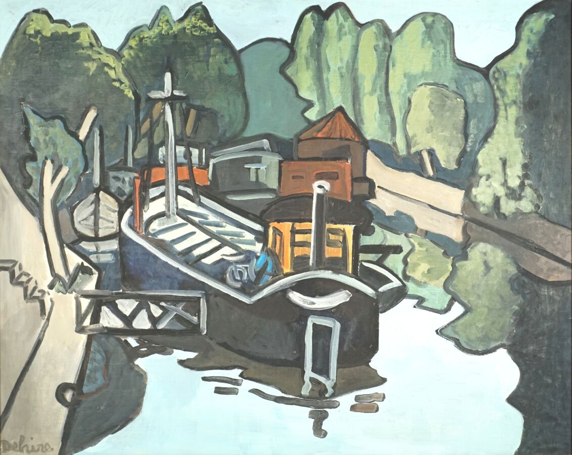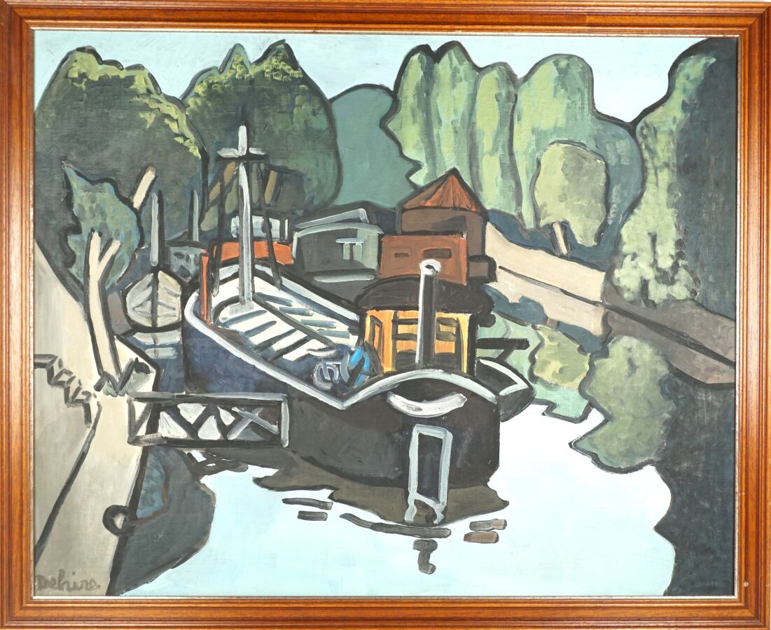 Guy DELAIRE (XXe), "Péniches à quai sur la Seine, Clichy-la-Garenne", huile sur toile signée en bas à gauche, 65 x 81 cm.