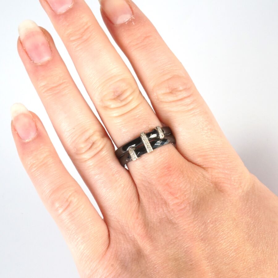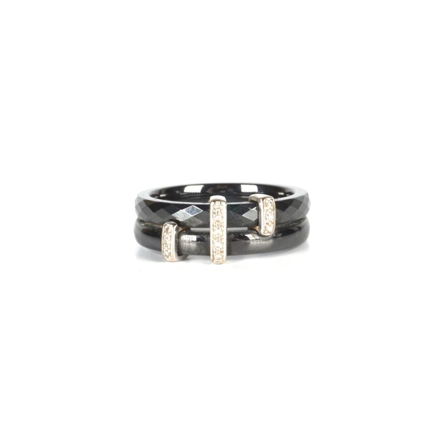 GUY LAROCHE : Bague à double anneau en céramique noir, l'un lisse, le second facetté, réunis par trois liens en or gris 18K (750/oo) sertis au total de 11 diamants ronds calibrant ensemble 0.05 cts, signée, Larg. 6 mm. TDD. 56.5/57. Poids brut : 5.7 g environ.