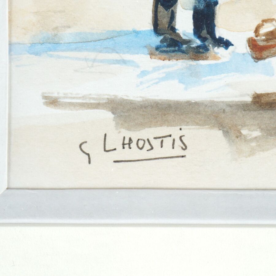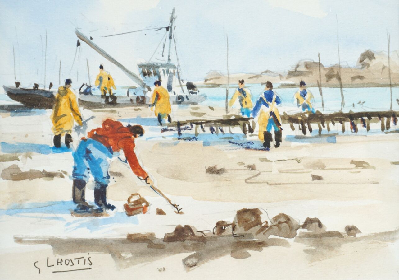 Guy L'HOSTIS (1945), "Marins au travail", deux aquarelles sur papier formant un pendant, signés en bas à gauche, 10 x 13,5 cm chaque.